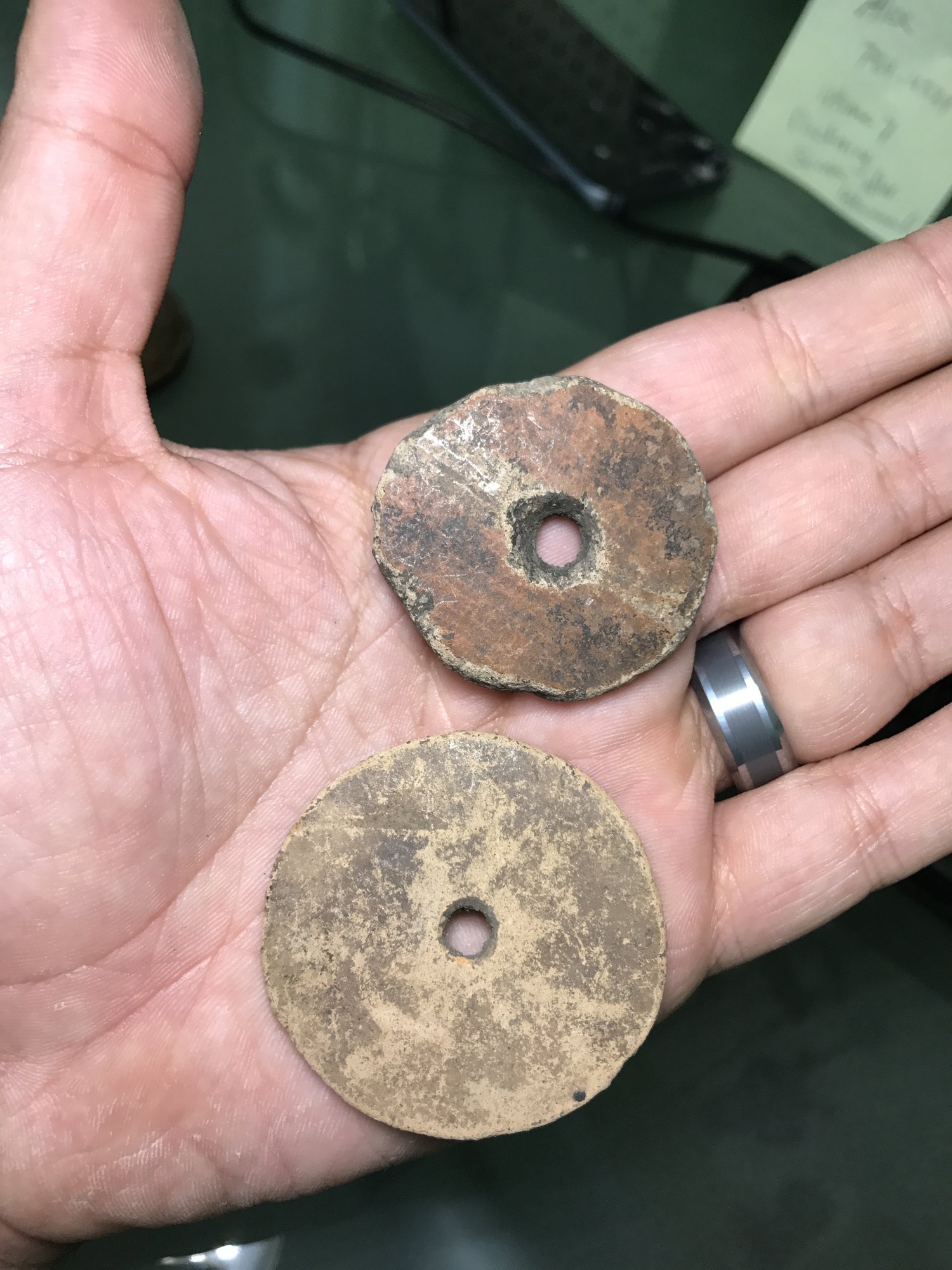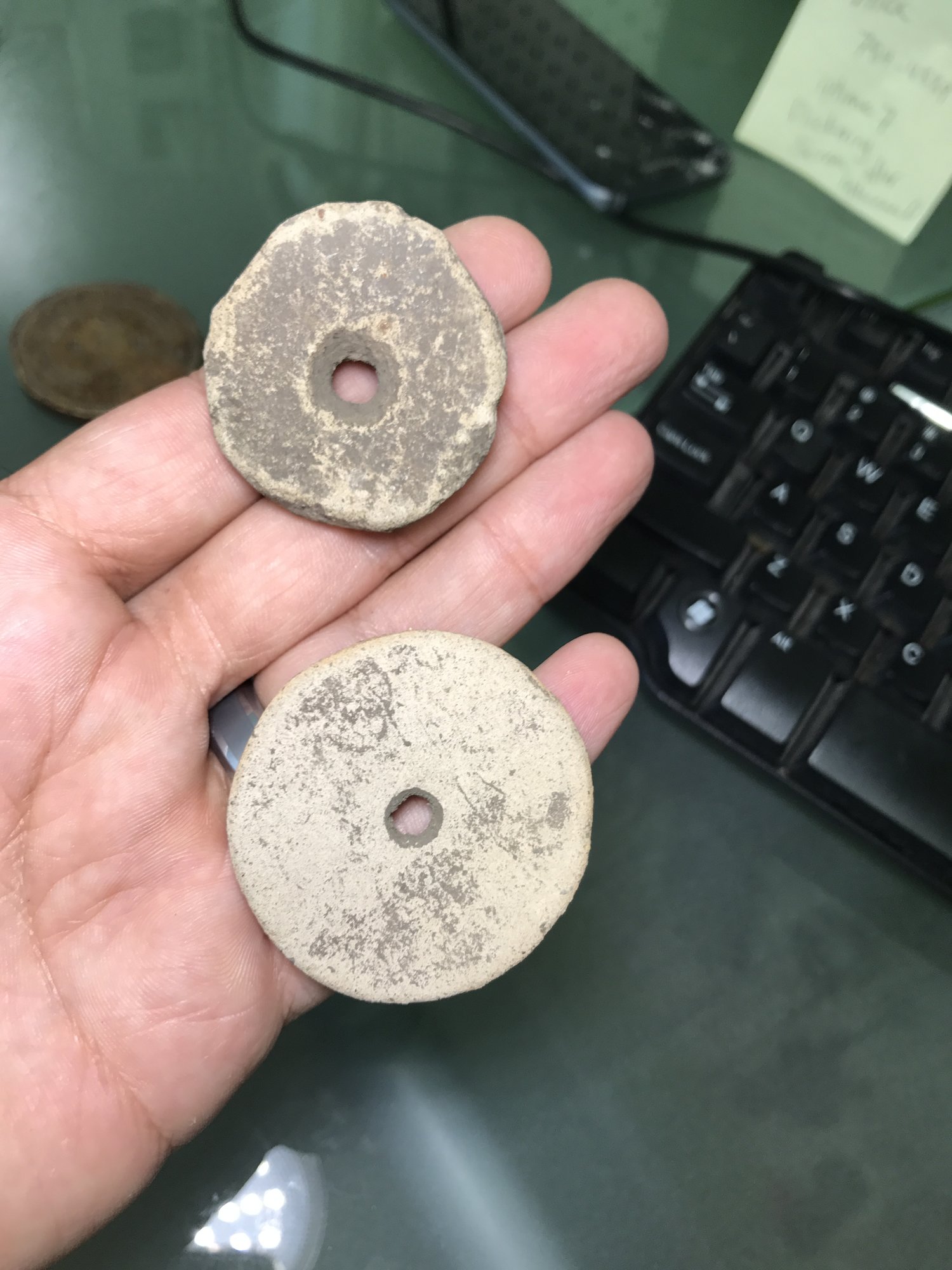 The ones with holes in them make me think of YAP coins but, I don't think YAP coins were ever made this small.