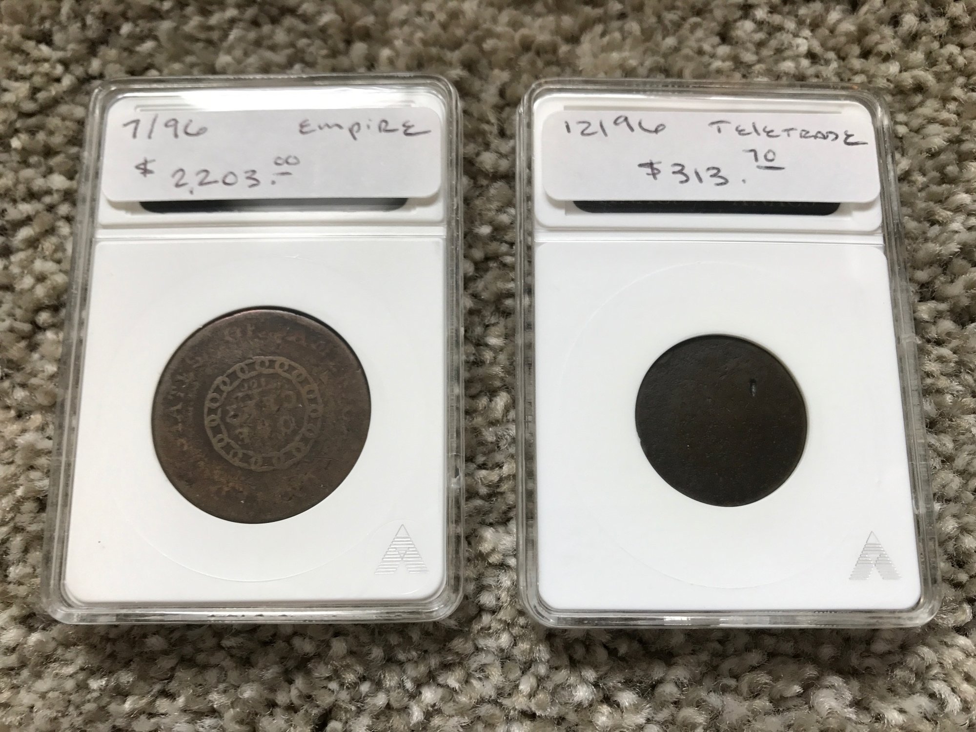 Bad cell phone pics of bad looking coins....actually the slabbed Lettered Edge example is decent for the grade. The obverse of the Vine&Bars is a near total disaster, but it does have a readable date.