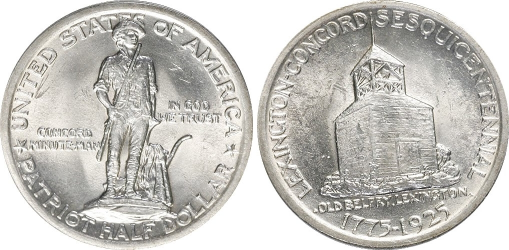 "The design of the half dollar bears a full-length figure of Liberty, the folds of the Stars and Stripes flying to the breeze as a background, progressing in full stride toward the dawn of a new day, carrying branches of laurel and oak, symbolical of civil and military glory. The hand of the figure is outstretched in bestowal of the spirit of liberty. The reverse of the half dollar shows an eagle perched high upon a mountain crag, his wings unfolded, fearless in spirit and conscious of his power. Springing from a rift in the rock is a sapling of mountain pine, symbolical of America."