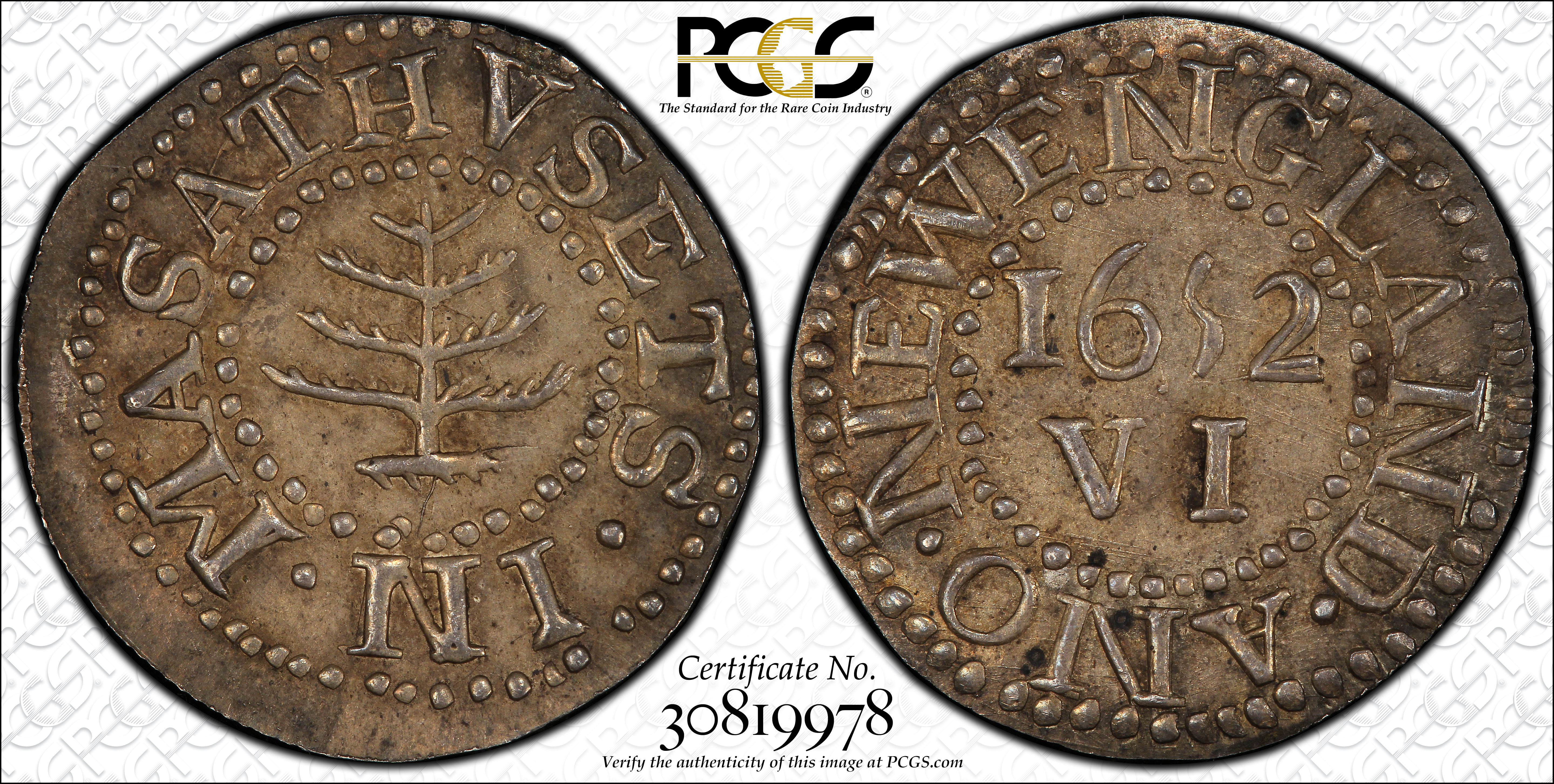 "1652" 6P PINE TREE, SILVER WYATT COPY MS63 CERTIFICATION #30819978, PCGS #534628 PCGS MS63