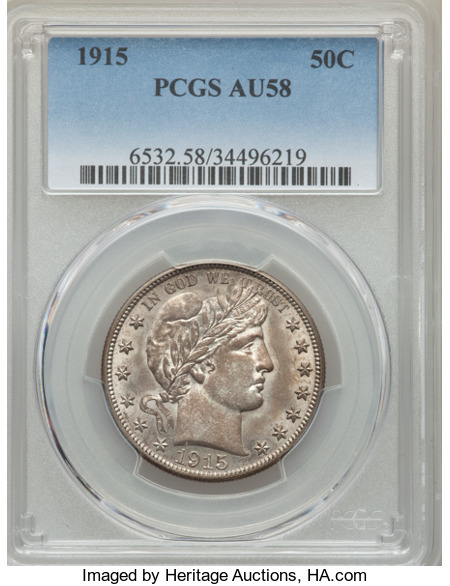 Heritage is offering the 1st 1915 PCGS AU58 Barber Half to be offered at Auction.