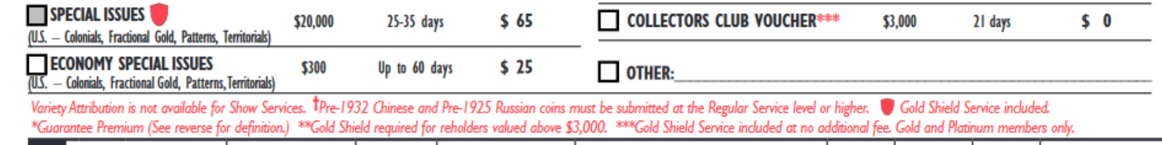 "Coins Required for Gold Shield Service: 1. All World (Non-U.S.) coins submitted under any service level other than Modern. 2. Any coin submitted under the Gold Shield-included service levels (Express and higher service levels).