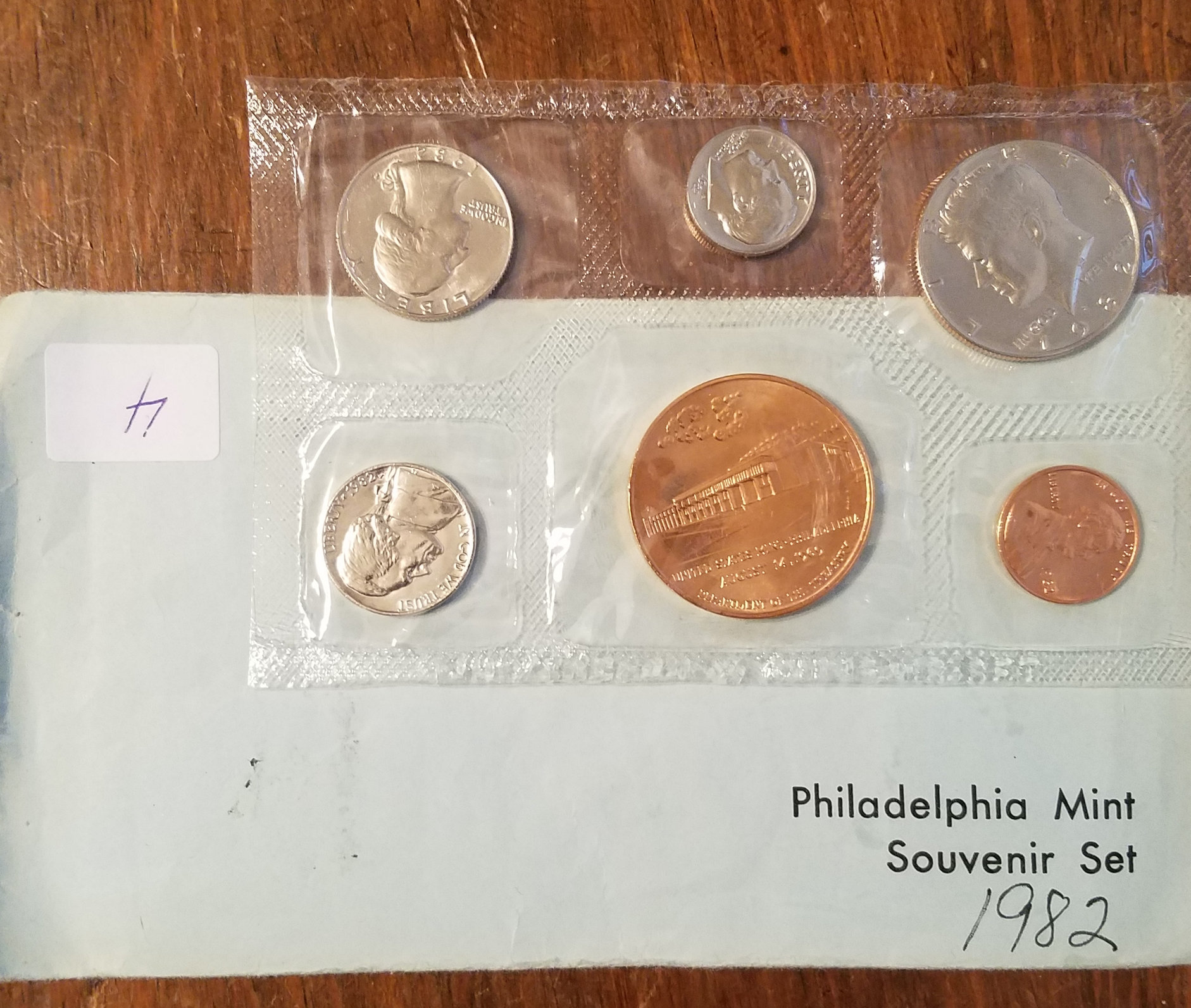 Looking further, I found an empty Philadelphia Souvenir envelope that had 1982 written on it and a price of $4. Rats, some one got the coins. As I get to the bottom, among some 60's proof sets, there it was. I put the coins back in the envelope and was glad to pay $4.