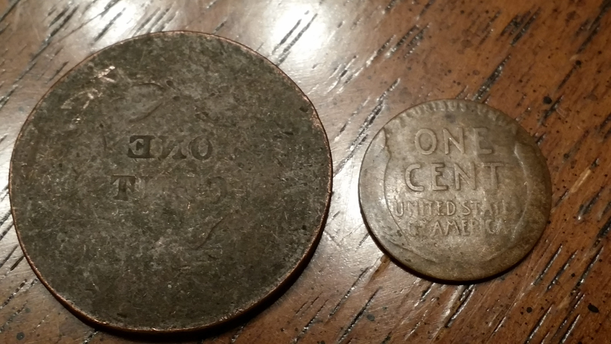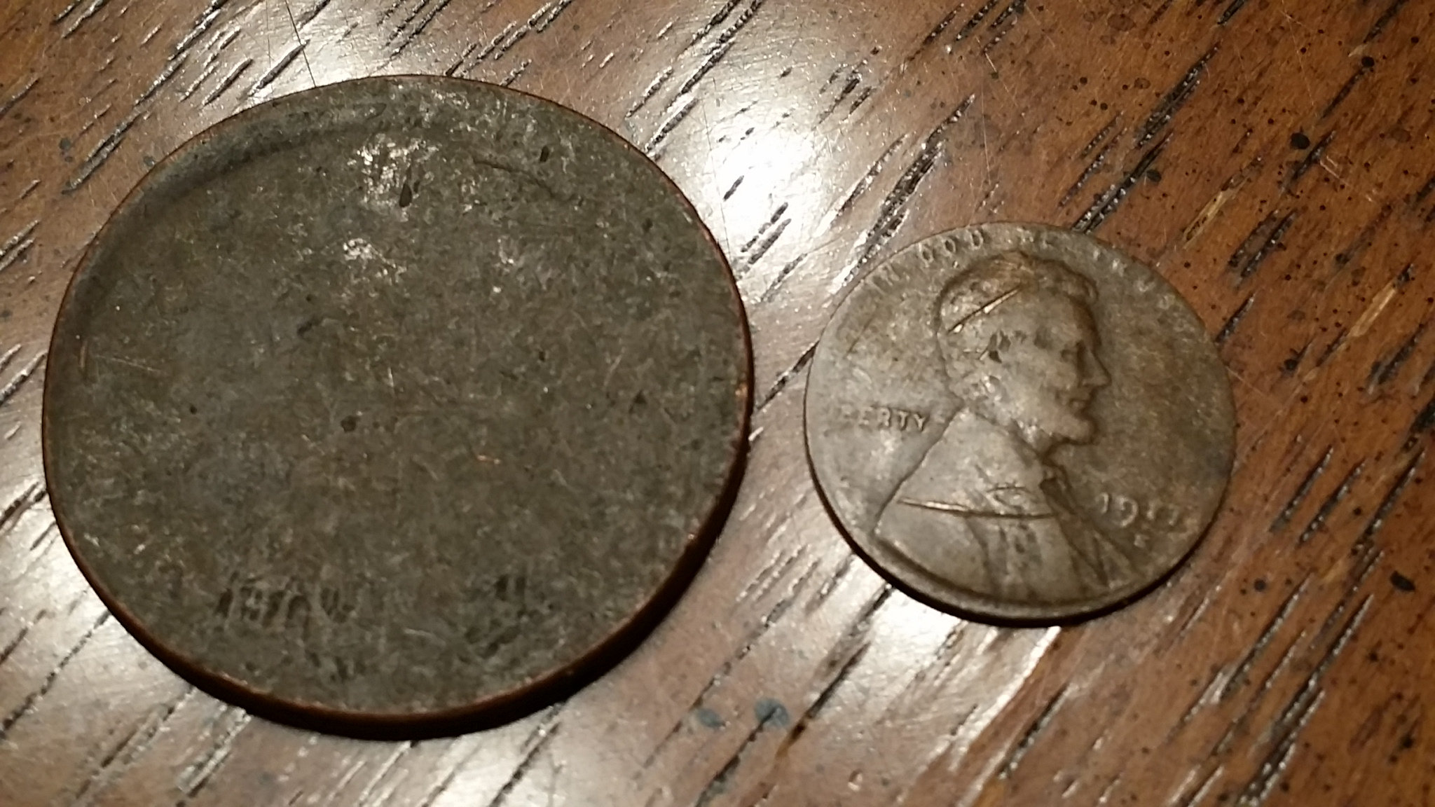 The large cent has a mirror image of ONE CENT and the 1917-S Lincoln is on a very thin planchet that's a full millimeter smaller in diameter than normal. Even on a Wheat that's fully worn clean would be much thicker than this.
