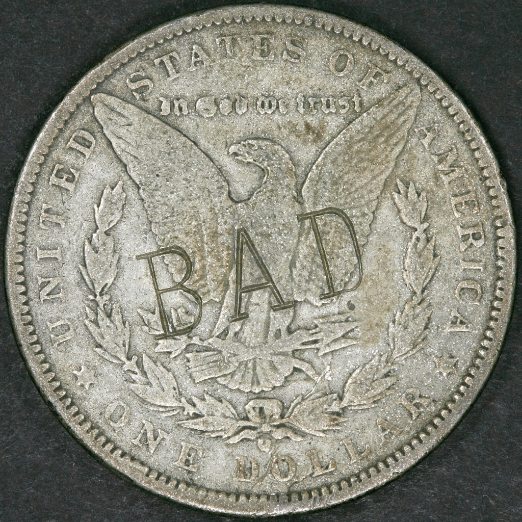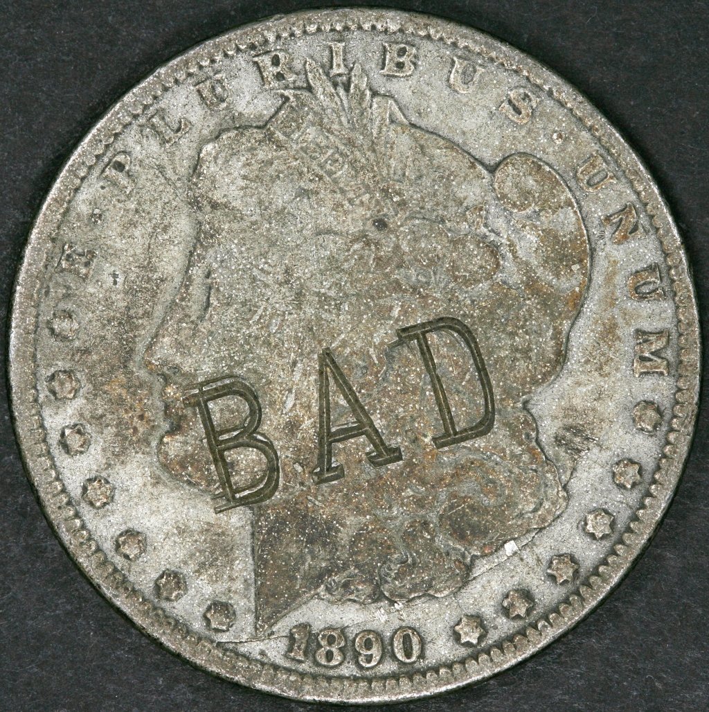 Having words, like "BAD" and "COUNTERFEIT" stamped on bogus paper money is not unusual. Getting counterstamp to punch in the word on a counterfeit coin is a step further.