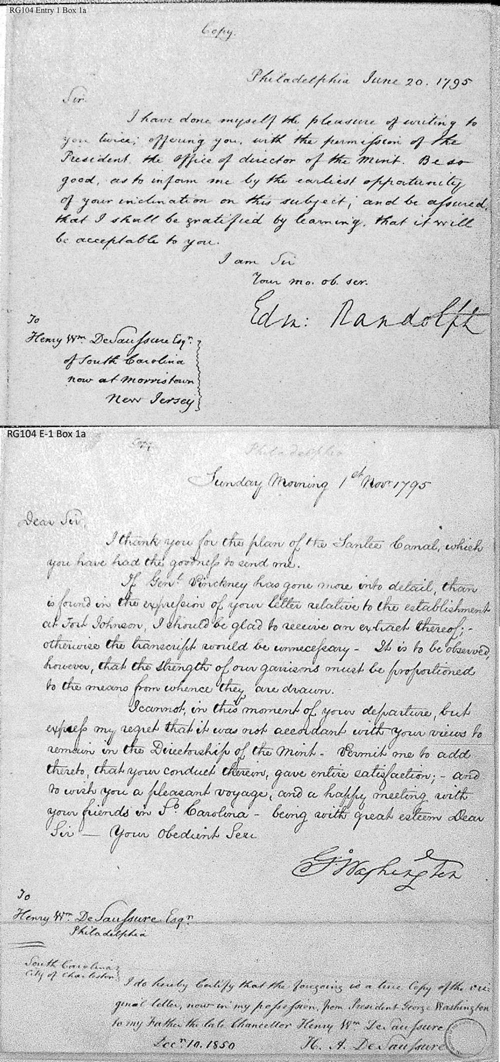Here are a couple of letters marking the beginning and end of Henry William DeSaussure’s brief tenure as Director of the Mint – July 11, 1795 to Oct. 28, 1795. (These are ‘imitative copies” made on December 10, 1850 by DeSaussure’s descendants.) The Washington letter along with DeSaussure’s resignation are in the George Washington papers.