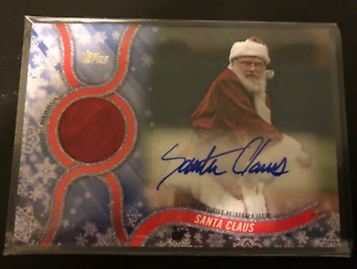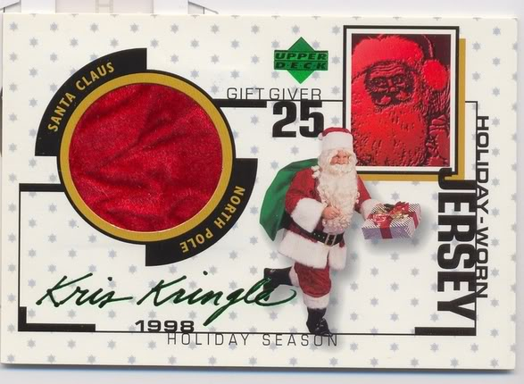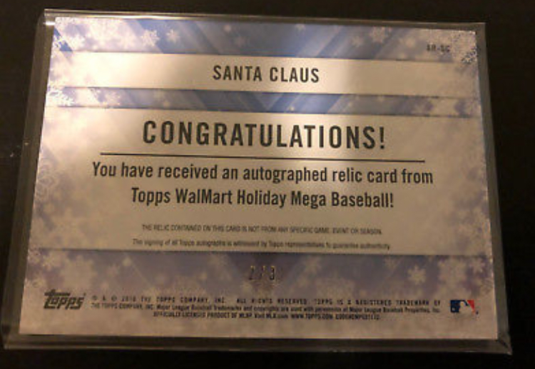 Typical Topps, probably from one of those North Pole rookie photo-op days where they have the elves put on the jersey then take it off just to say it's been 'worn'. Stuff like this is terrible for the hobby. You'd think Topps could get something sleigh-used from a guy who's literally been around for hundreds of years.
