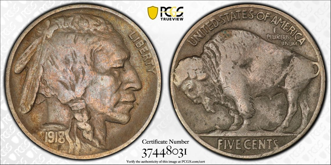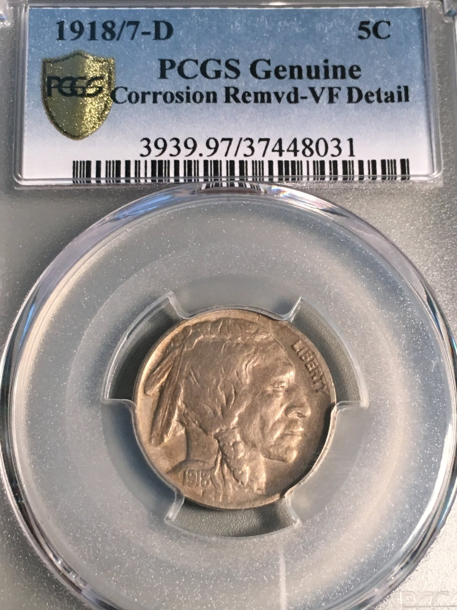 I got my grades online for my 45 coins, of course, before getting the actual coins returned to me yesterday. Besides the 1909-S Indian cent QC Unc Details that has already been shown, I had a 1918/7-D Buffalo that I had hoped might straight grade VF25. Yes, it had some problems, some dark spots/bit of verdigris on the back, chiefly ... But I chose to be optimistic! Nonetheless, the online grade showed as Environmental Damage (97)-VF Details.