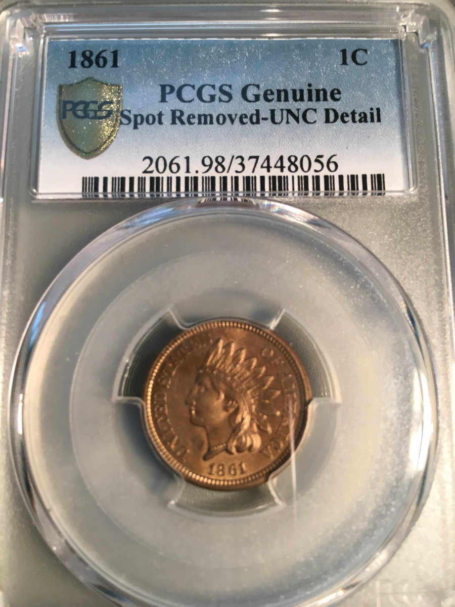 The same is true of the 1861 Indian Cent . As in the prior instance, this coin received the 98 “spot removed” grade as part of the normal grading process, but the “spot removed” comment does not appear online.