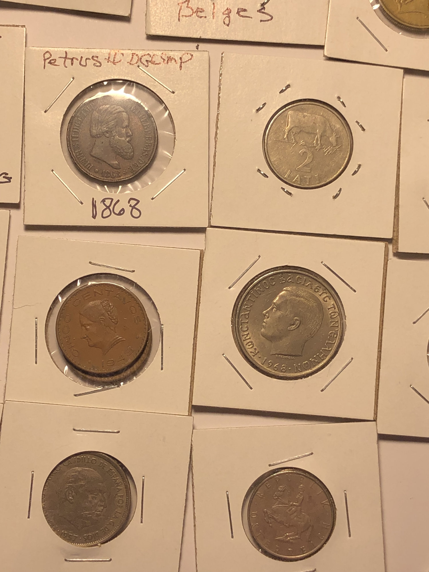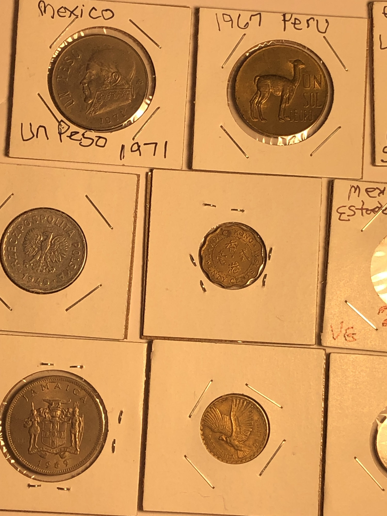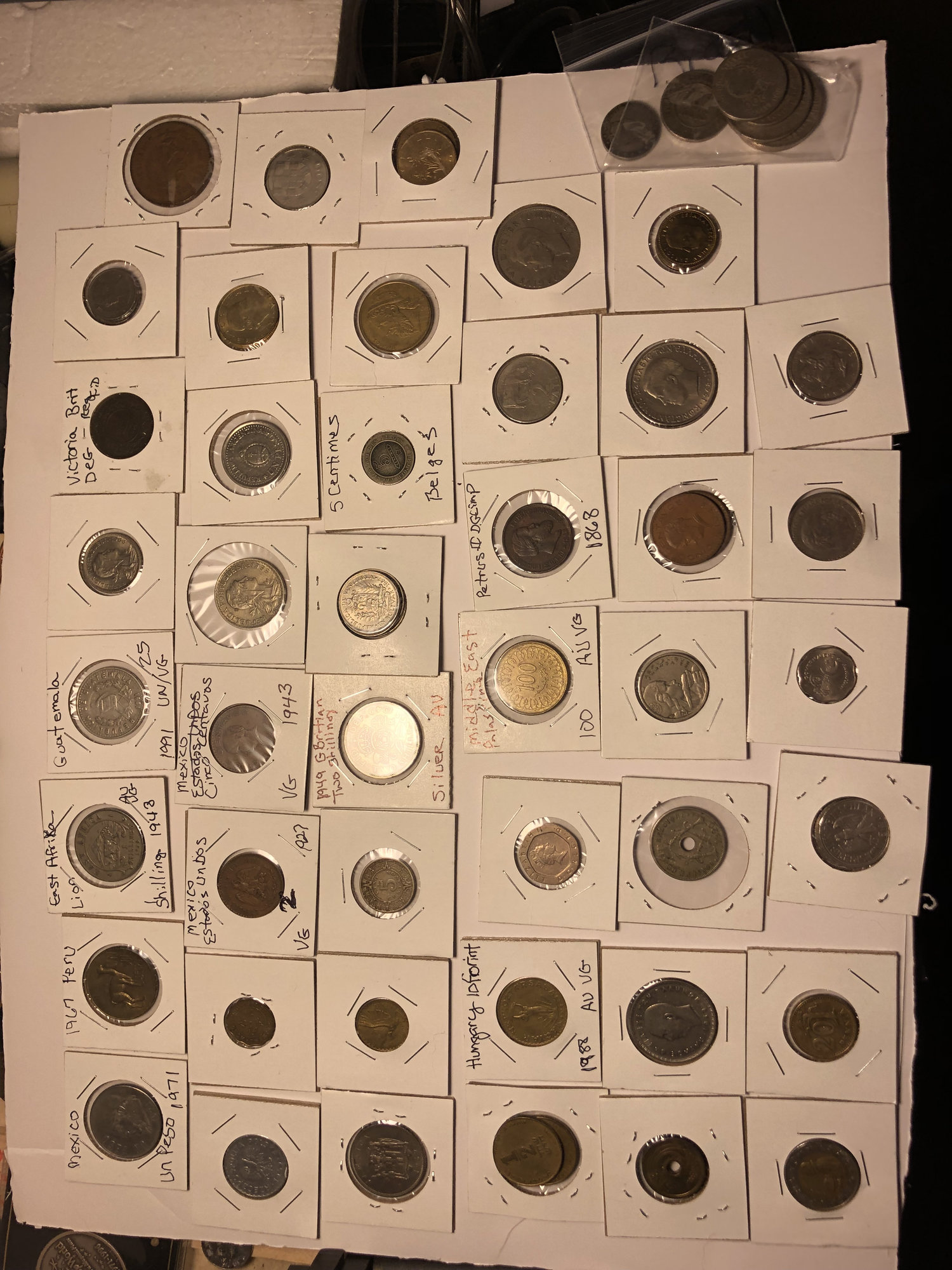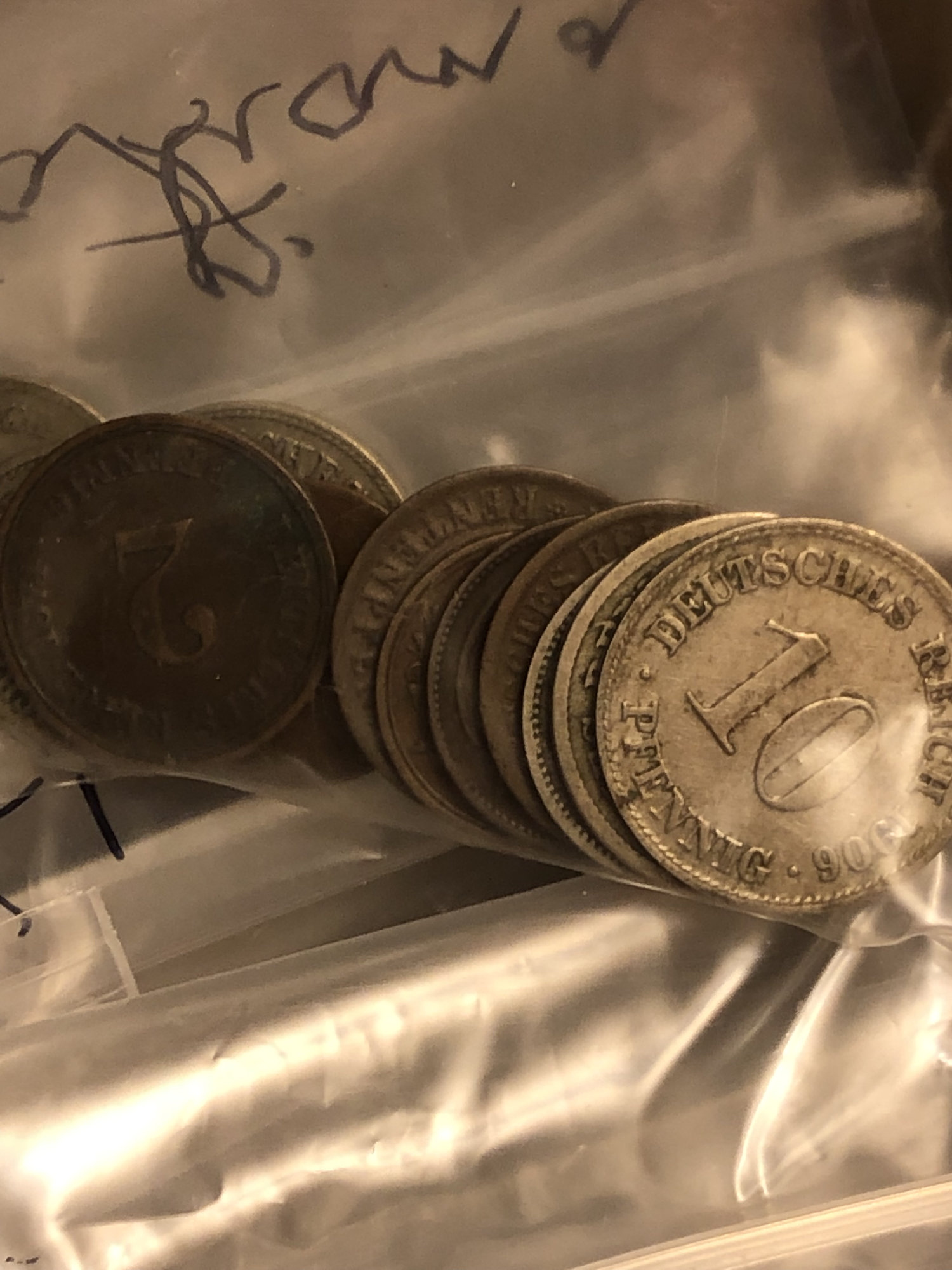 If it wasn't part of the stuff you got, you should try to get a copy of Krause World Coins. It doesn't need to be a new one and can be in the 1990's ... just use it as a reference to see what some of the coins are valued at and what they were made of. Check out the silver ones first.... just because something is old doesn't make it valuable. Almost all seem to be very common, inexpensive items, but it will be great fun looking them up and ID'ing them. Silver is about $15.50 per troy oz, but most coinage is .500 .600, .800 or, if old enough, .900 or .920 silver purity.