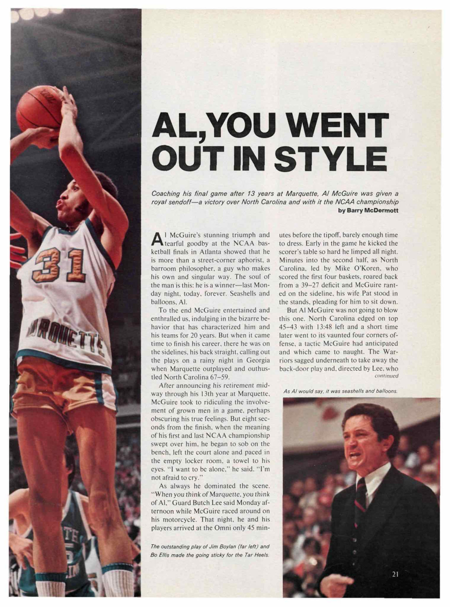 1977........... Marquette beats UNC-Charlotte in the semi with a length of the court pass and stuff at the buzzer. Beating North Carolina in the final was almost an anticlimax. Al McGuire's final game. It's all seashells and balloons.................