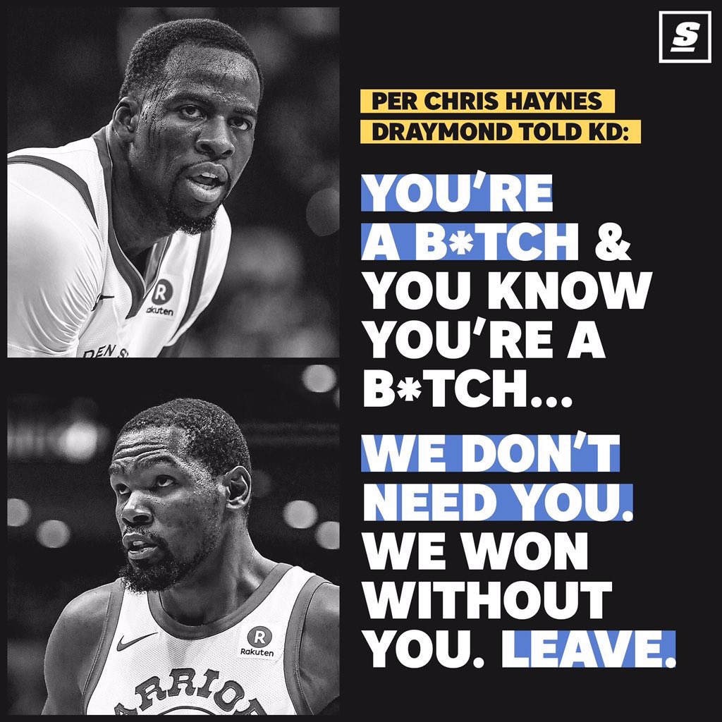 I just wonder if that rift between KD and Draymond Green had a lot to do with KD leaving GS. Draymond really let him have it verbally. There was also a little beef between Curry and KD about the Under Armour shoes comments. I just think there was too much bad blood between KD and the other players on the team.