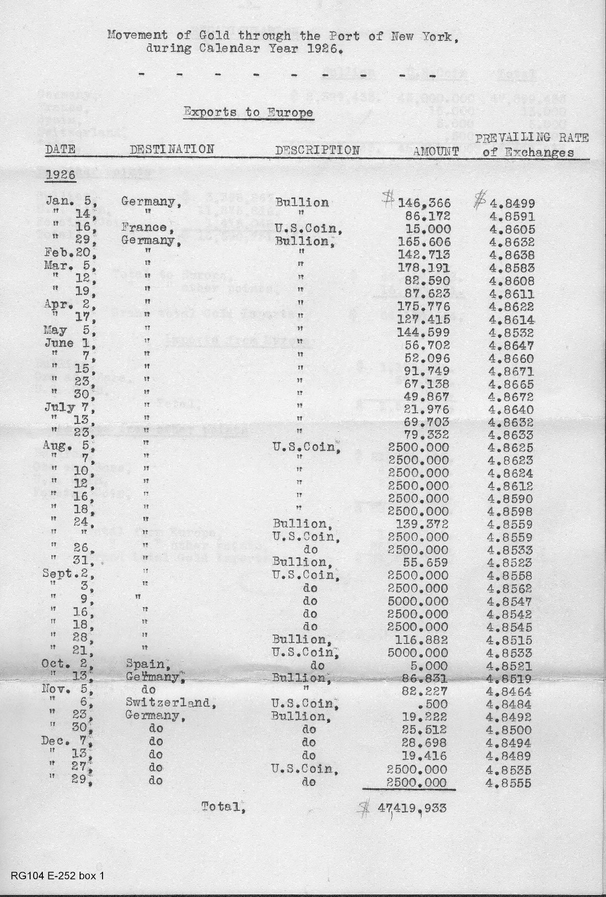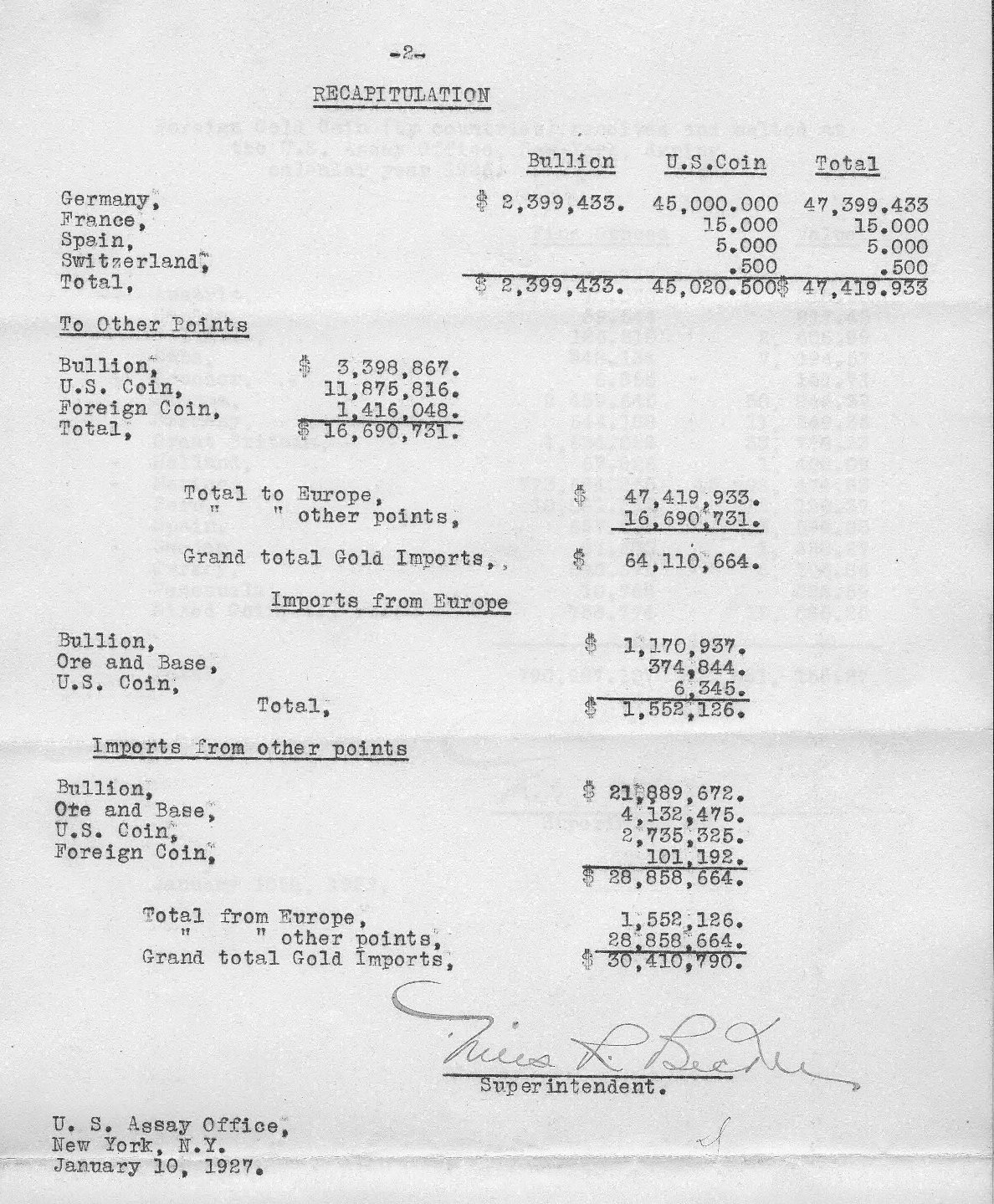 This is the annual summary of gold exported/imported via the New York Assay Office in 1926. Note the large sums to Germany as part of refinancing War Reparations through American banks. This kind of thing brought large profits to Andrew Mellon's banking empire and economic and political instability to Germany.