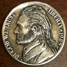__A hobo nickel is carved as opposed to engraved. Little by little metal is shaved away or mounded to create a miniature bas relief sculpture. Historically these coins were made by hoboes, itinerant workers, who often traveled by hopping freight trains. The hobo's tools were primitive and consisted of awls, nails, pocket knives, a small hammer, screwdrivers, and even found pieces of metal which were manipulated into makeshift tools. A metal "punch" was also hammered into the coin to create a divot for an eye, an expanded nostril, or texture for hair.