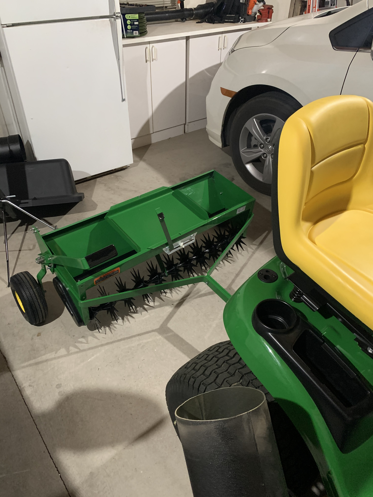 Green happens to be my favorite color. So with that said here is my pretty green type 1 Buff and my mean green, John Deere, mowing machine😊. I also bought a aerator/spreader to make my lawn the greenest for miles around. I love taking care of my yard. It’s one of my favorite things to do in my old age.