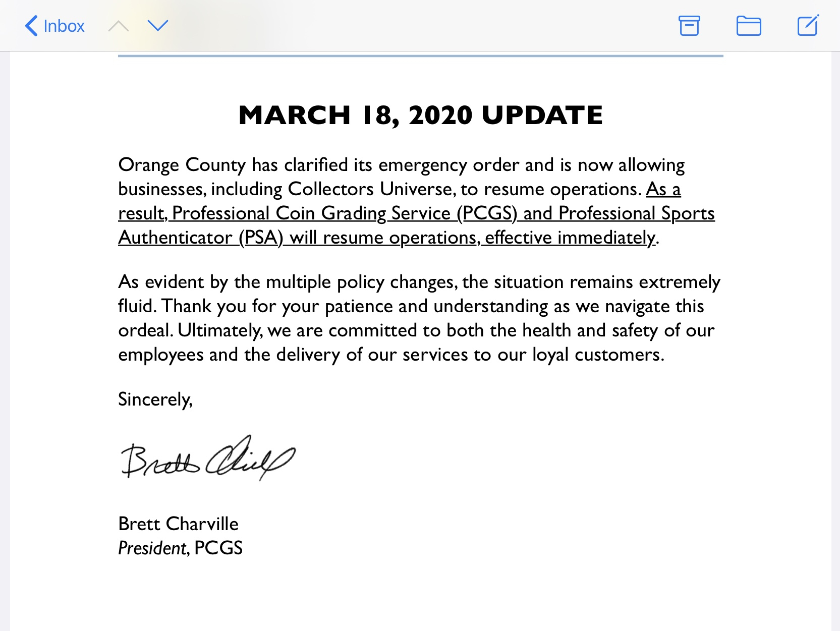 Orange County has clarified its emergency order and is now allowing businesses, including Collectors Universe, to resume operations. As a result, Professional Coin Grading Service (PCGS) and Professional Sports Authenticator (PSA) will resume operations, effective immediately.