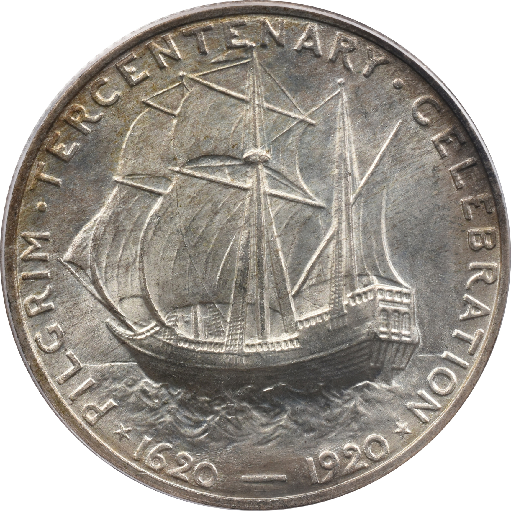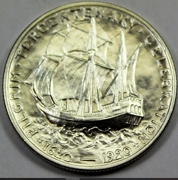 Reverse: The Mayflower sailing to left; around upper border: PILGRIM TERCENTENARY CELEBRATION, and at lower left border: 1620 - 1920.