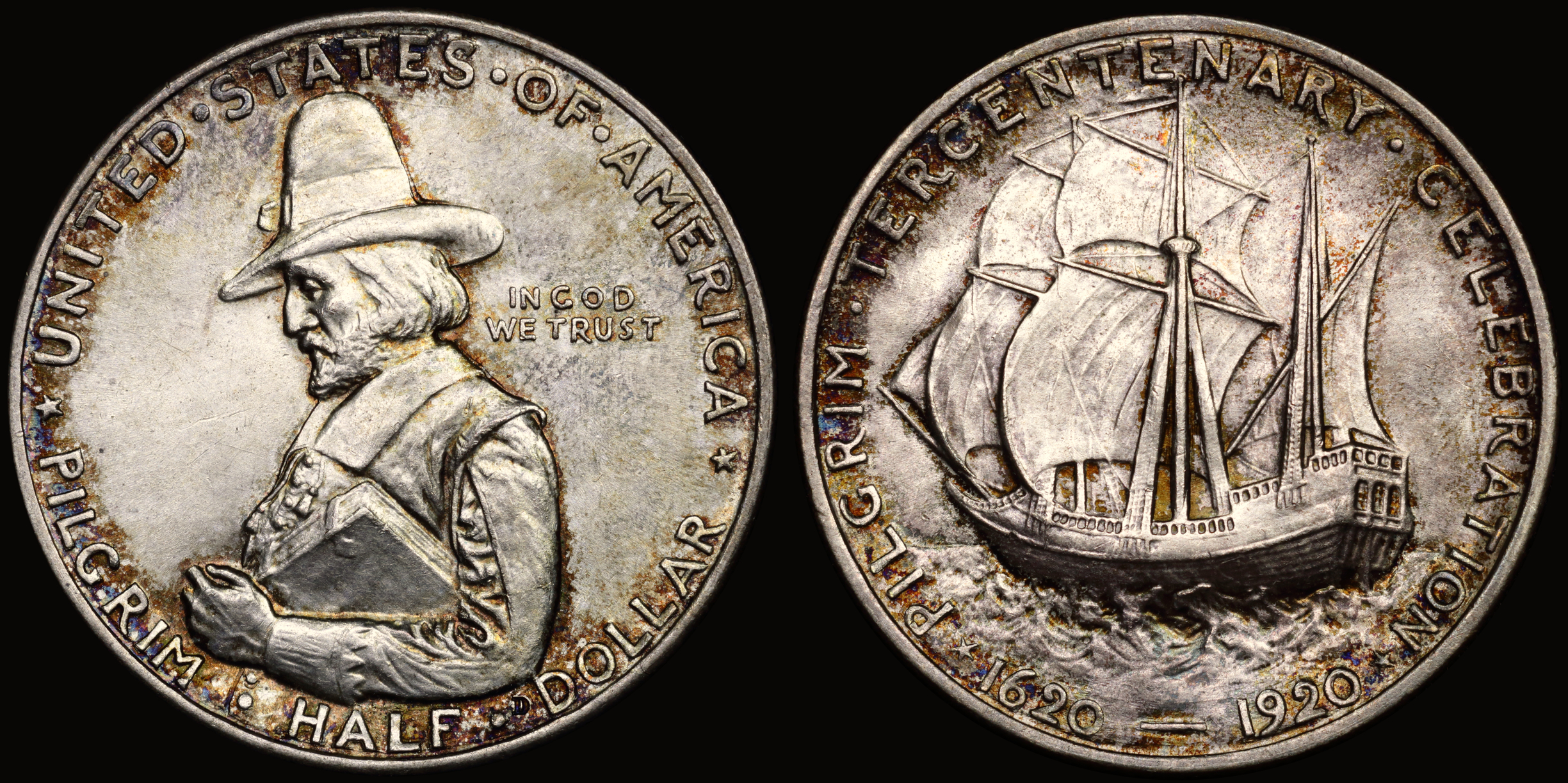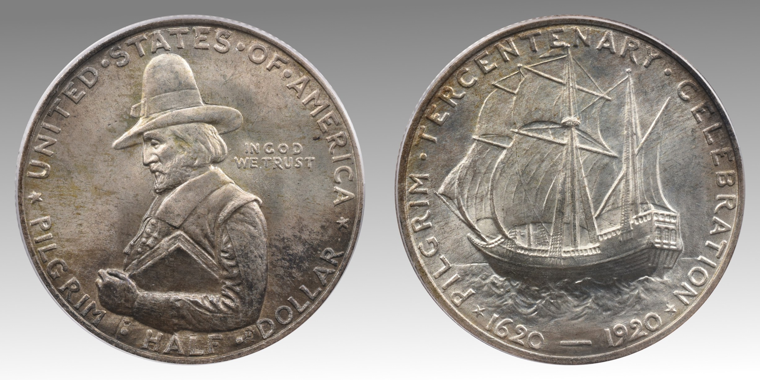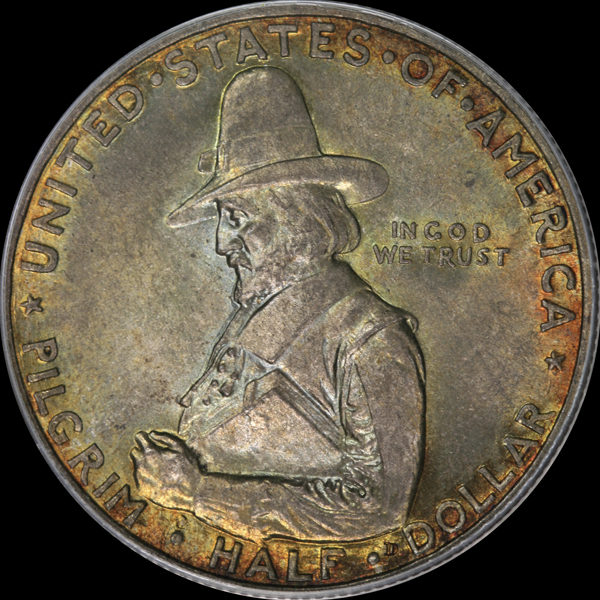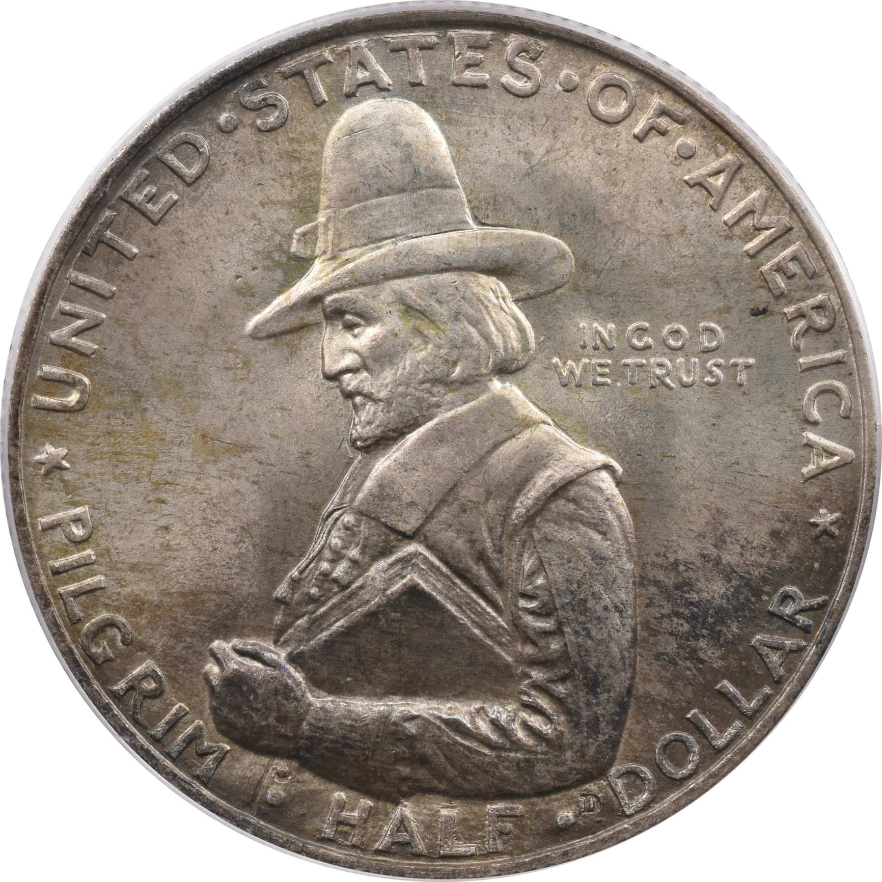 Obverse: Half-length portrait of Governor Bradford to left, wearing conical hat, and carrying Bible under left arm; in filed back of head, in small letters: IN GOD / WE TRUST Above, around border, in larger letters: UNITED STATES OF AMERICA Below, around lower border: PILGRIM HALF DOLLAR Under elbow, a small incused D for Dallin.