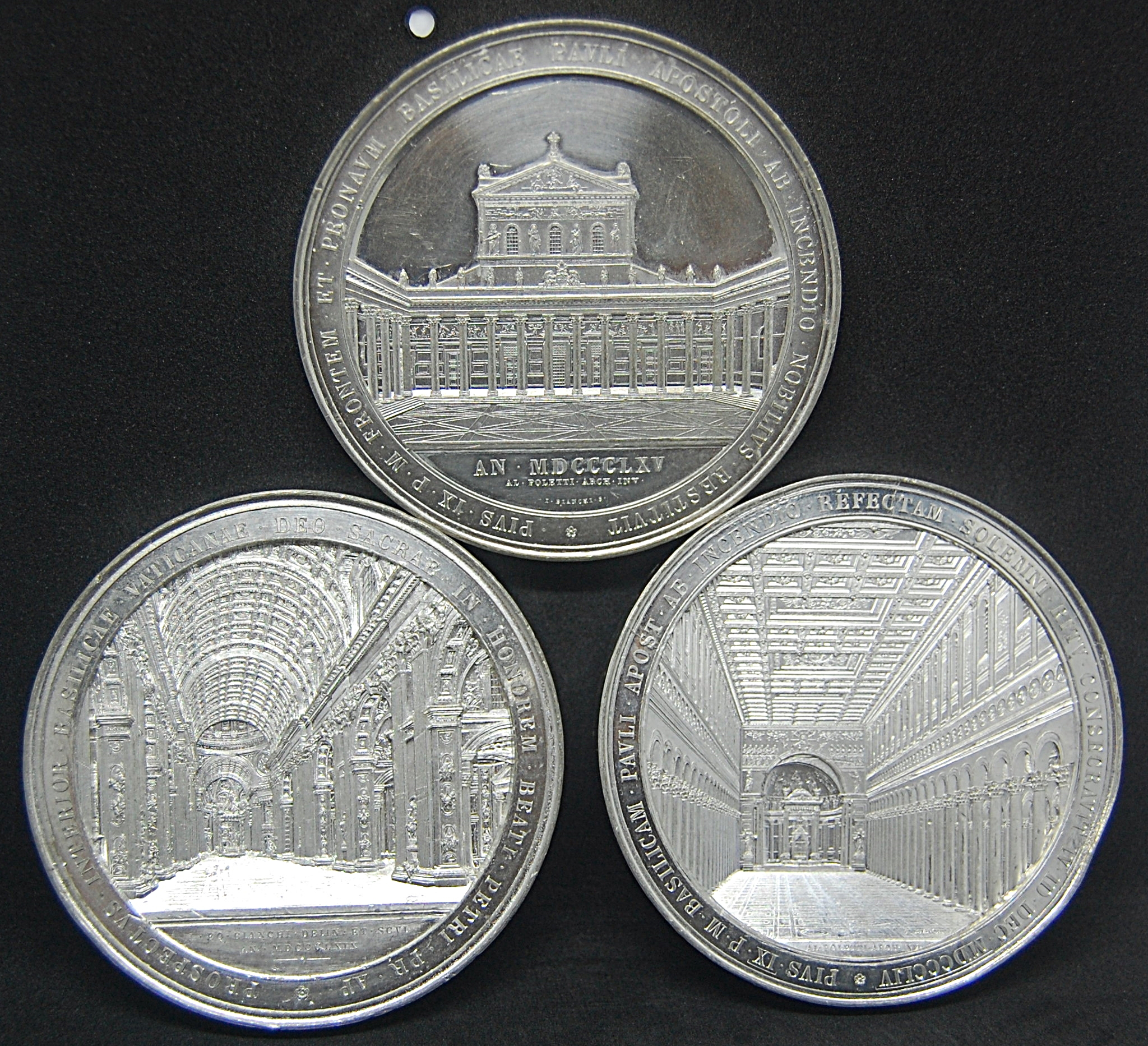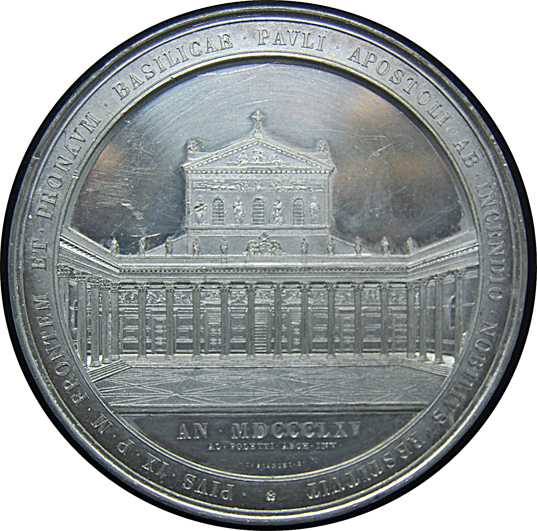 Reverse: Interior view of the Basilica of Saint Paul Outside the Walls, looking down the central nave towards the apse. Around the border, PIVS · IX · P · M · BASILICAM · PAVLI · APOST · AB · INCENDIO · REFECTAM · SOLEMNI · RITV · CONSECRAVIT · IV · ID · DEC · MDCCCLIV. In exergue, AL · POLETTI · ARCH · INV ·. At the base of the floor, I · BIANCHI · FECIT ·.