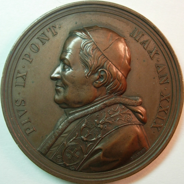 Obverse: Bust of Pius IX facing left, wearing zucchetto, mozzetta, and decorative stole. Around, PIVS IX PONT · MAX ·. Below, I · BIANCHI F ·.