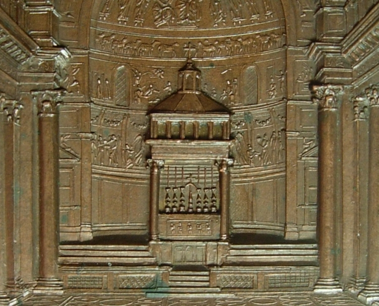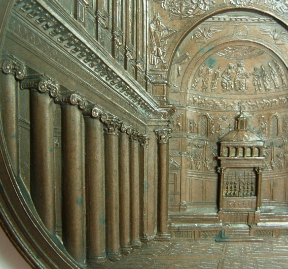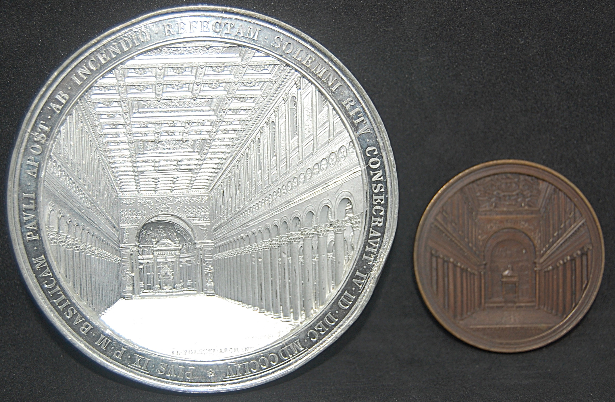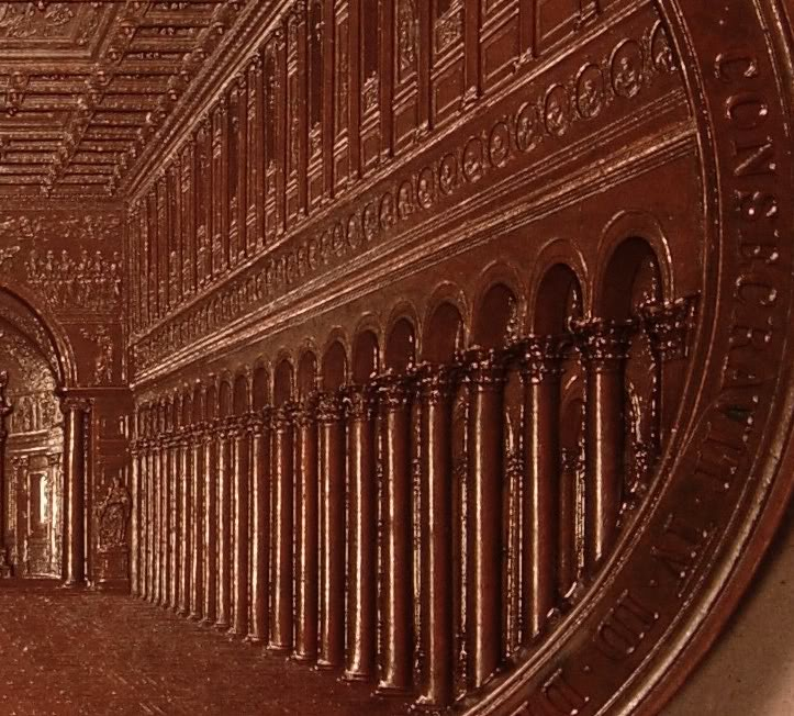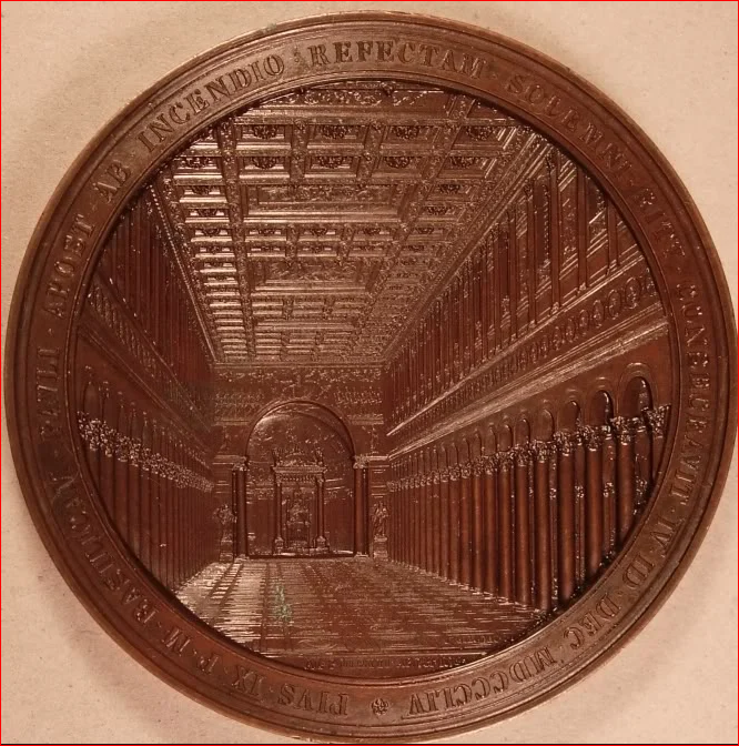 This Medal was issued to commemorate the consecration of the Basilica of Saint Paul by Pius IX in 1854 and was created by Giuseppe Bianchi. The reverse of the medal features a stunning three-dimensional engraving of the central nave of the reconstructed basilica. The architect of the reconstruction, Luigi Poletti, is mentioned on the reverse in the exergue inscription. The date of the consecration (December 10, 1854) is provided on the reverse using the Julian calendar (IV · ID · DEC · MDCCCLIV). The reverse inscription can be translated as "Basilica of the Apostle Paul, from the Fire to Solemnity by the Ceremony of Consecration".
