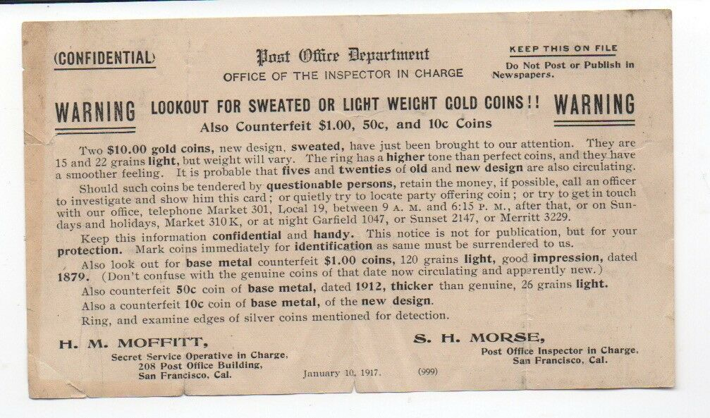 Interesting notice for sale on eBay. “ Up for auction is a rare 1917 Flier put out by the Post Office Dept at San Francisco warning the public about Sweated or light weight Gold Coins. The Officers in charge were Postal Inspector S.H.Morse and Secret Service Operative H.M. Moffitt. it measures 6.25 x 3.5 inches and has folds with a two inch tear along end of one fold and light edge wear”