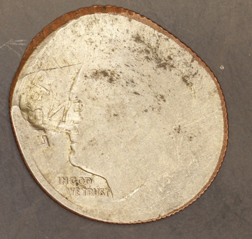 The first coin is a copper-clad dime that had a run-in with Casey Jones.