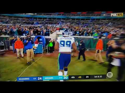 Quinton Jefferson was not fined for attempting to go after the fans, but he was fined $9,115 for the unnecessary roughness penalty that got him ejected from the game. I think the Jaguars fans were upset because the Jaguars had the game wrapped up, and they were in a victory formation, but the Seahawks defensive line continued firing off the ball and roughing the Jaguars players up, which led to some scuffles, which is why Jefferson was ejected for unnecessary roughness. The fans were probably pissed off because of that, so they threw food at him.
