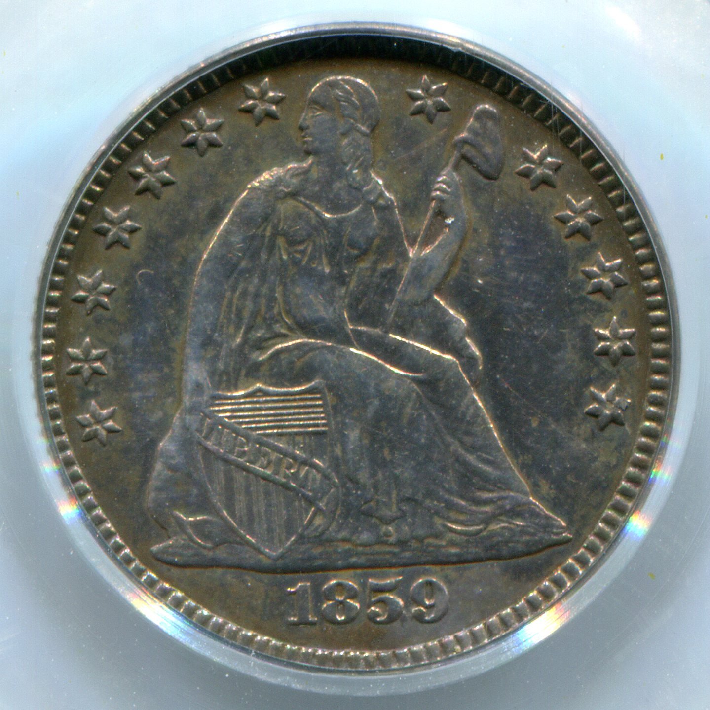 Here's the lowest graded of seven at PCGS, a PR 61 with a green bean. NGC also has seven, but they have graded one lower, PF 58. It's the 1859 transitional half dime, a "coin without a country". Estimates are that only about 20 of these were struck. Amazingly, that minuscule production made use of two obverse dies! Mine is one of two known from its obverse die. Show us your favorite bottom pop coins, and tell us why they're special.