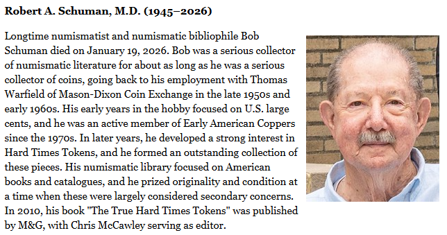 It was an interesting auction to watch for sure. Many of these hard times tokens, I have never seen in the state of preservation he presented. Can anyone with a hard copy of the auction catalog post Dr. Schumann's biography? I'd love to read about the person behind these pieces and how the collection was formed if they included that in the catalogue.