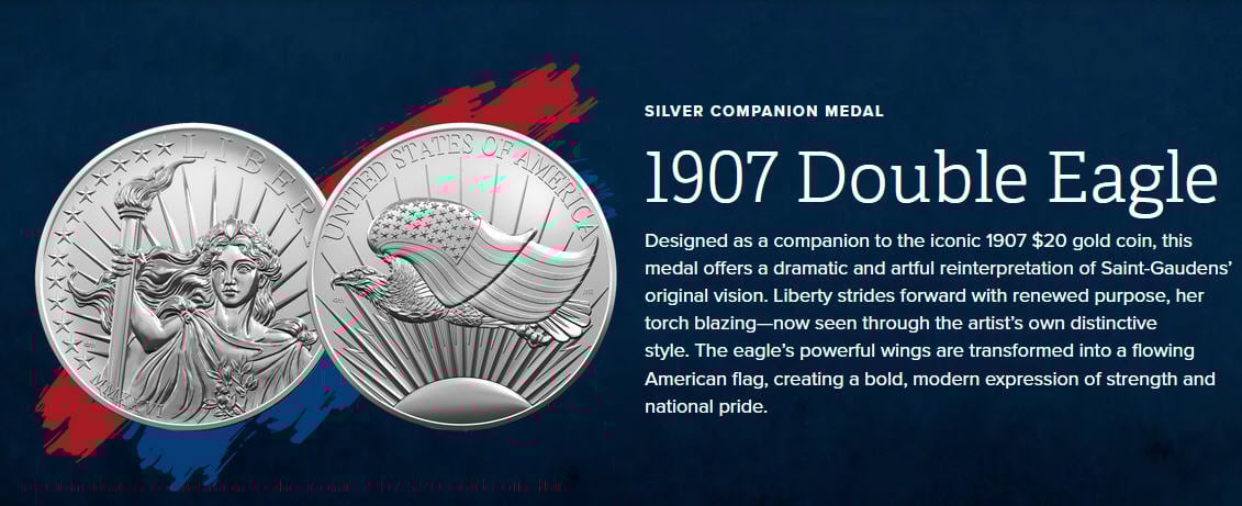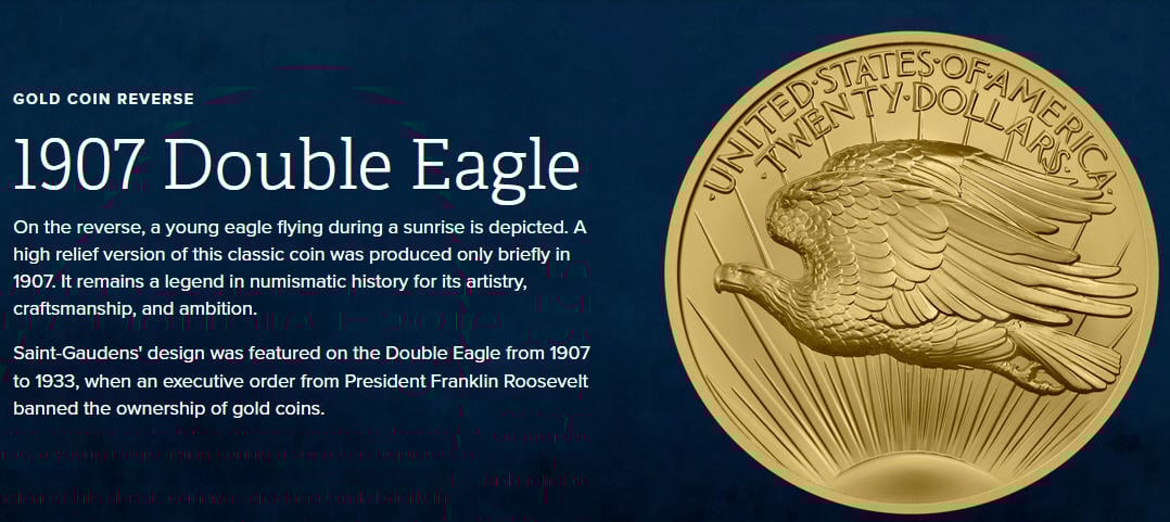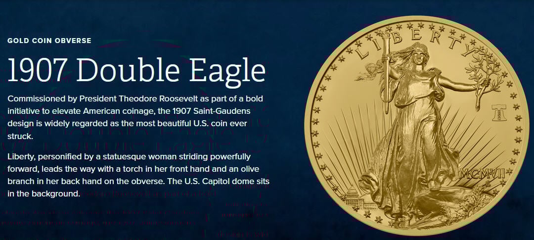 A 1-ounce .9999 fine gold coin using the designs from the 1907 Saint-Gaudens, Roman Numerals (MCMVII), High Relief gold $20 double eagle.
