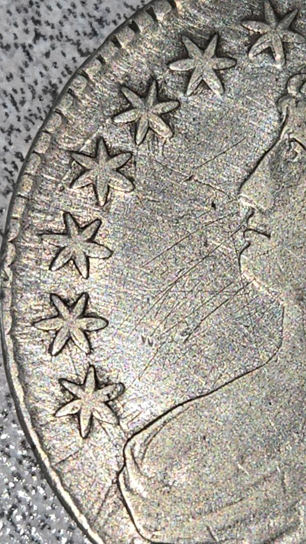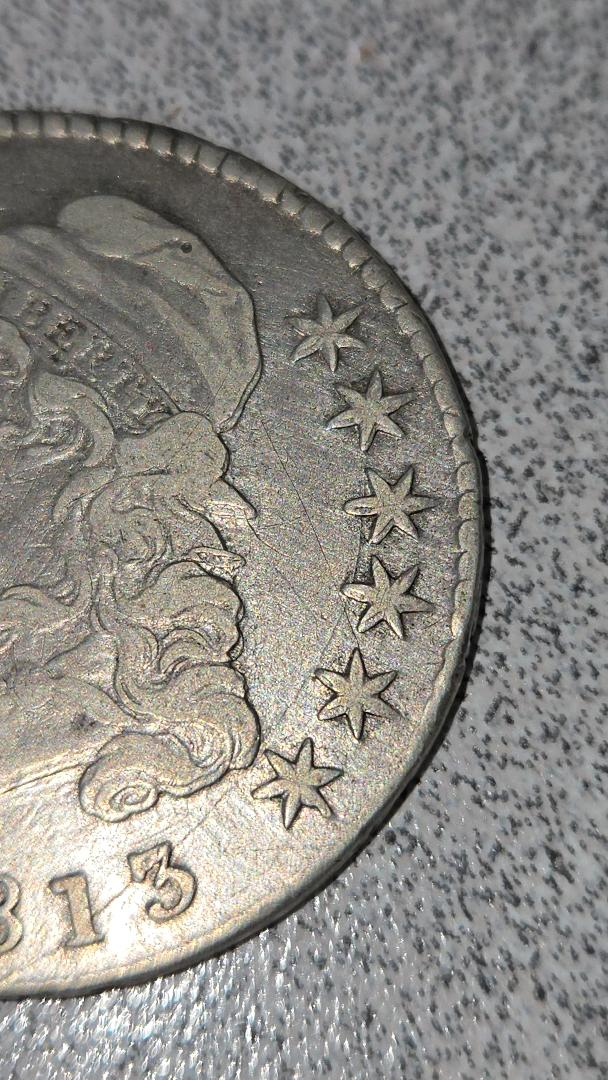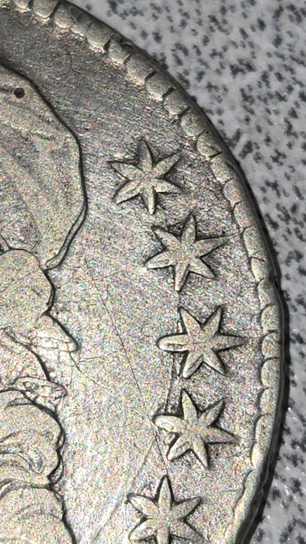 Saw this lady on Ebay. Bust half errors are my main interest of study. This double striking effect apparent only on the face of Liberty (highest point on obverse) is the result of a great shift between the dies causing extreme machine doubling. Notice there is no other evidence of doubling on any other devices. Although this example is dramatic and could sell for a small premium, it is not a mint error and not double struck. Seller had this coin listed two days ago for $15,000, lowered it to $14,000, then ended the listing for an unknown reason.