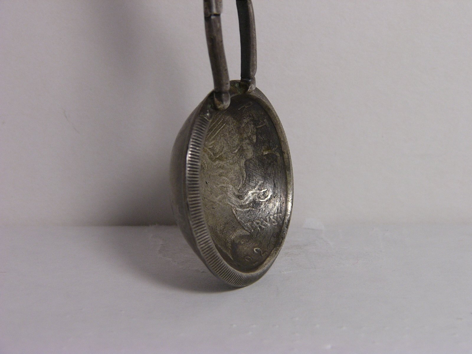 At first I put a pocket piece in it. But then decided that was not getting much use. So then put one of my 'iffy' toned dollars in it (okay more than 'iffy'). Put a string through it and now hanging on one of the shelves (full of stuff).