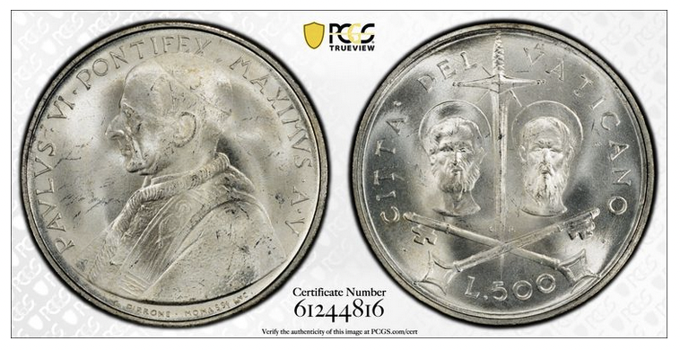 500 Lire (11.0g, .835) Circulation issue. St. Peter and St. Paul.
