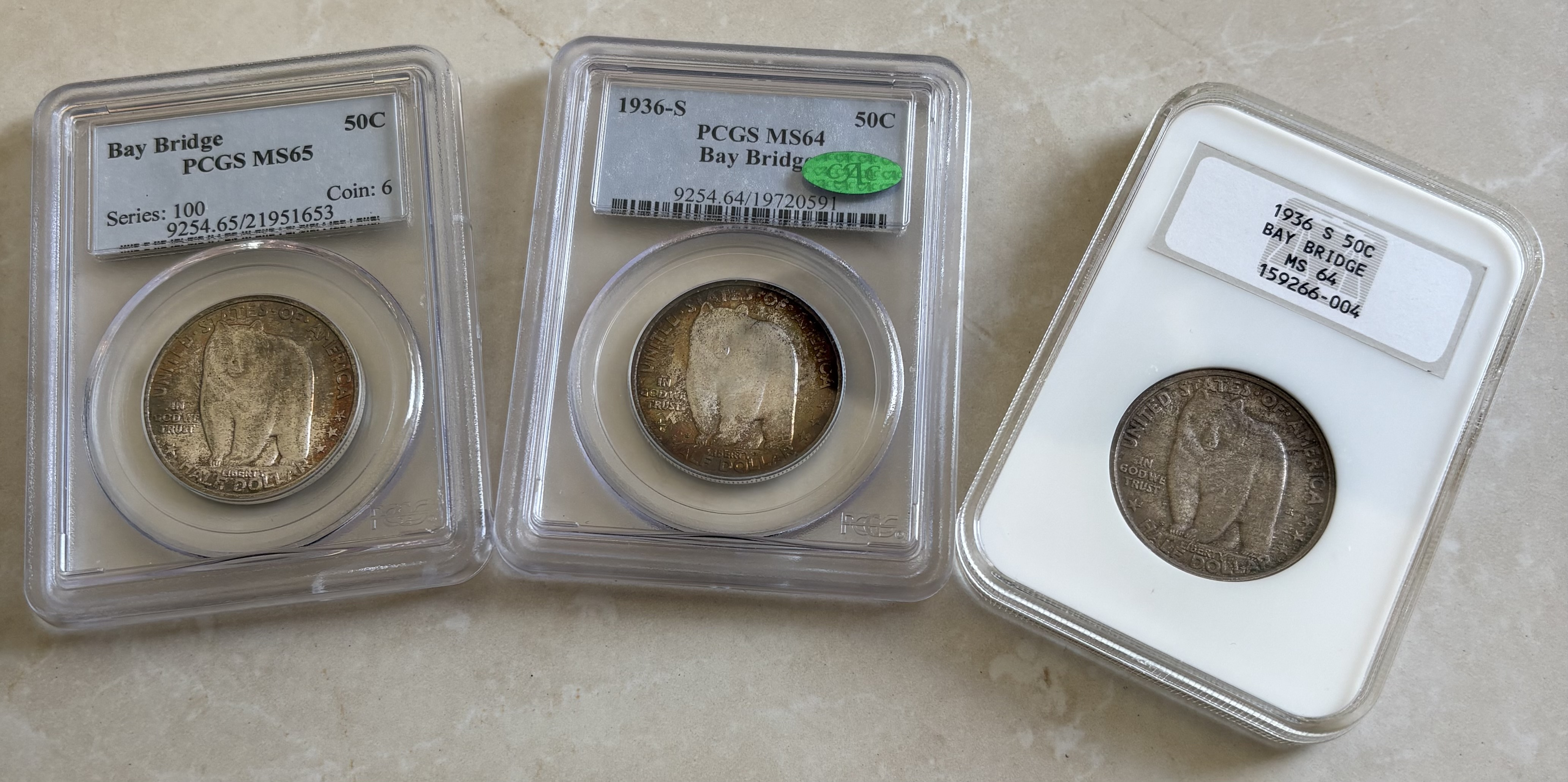 Three circulated commemoratives back from grading. The Trueviews are mostly poor again from overexposure. I'm going to have to edit all of them except for the Bay Bridge.