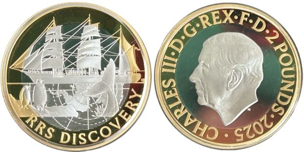 2025 UK RRS Discovery, €2, 24g .925 Ag and 15.98g .999 AU, 28.4mm