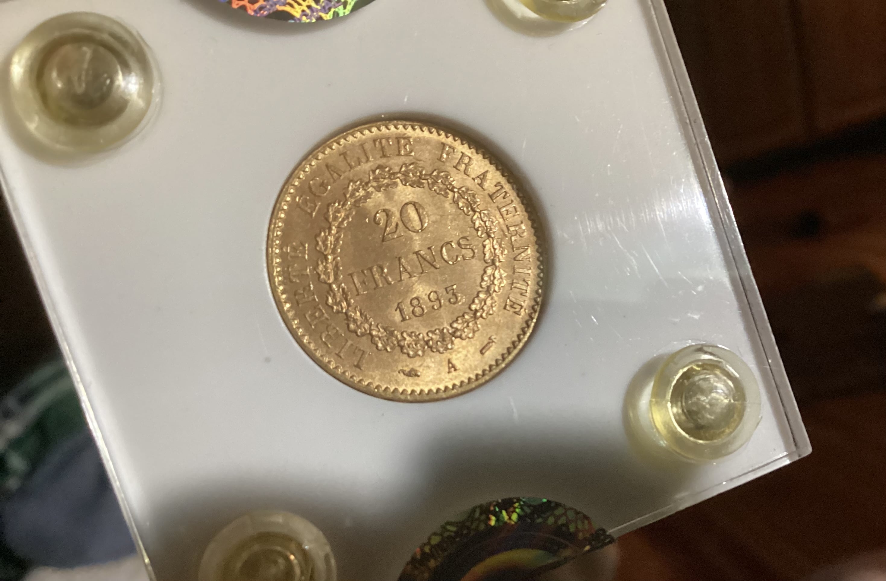 The 20-Franc coins are “Marianne-Coq” to the French. I collect them, but I’m lacking the 1900 & 1902 dated pieces. Also need the 1898 pattern. Three of mine are slabbed, the rest are raw. Here’s one in MS64…