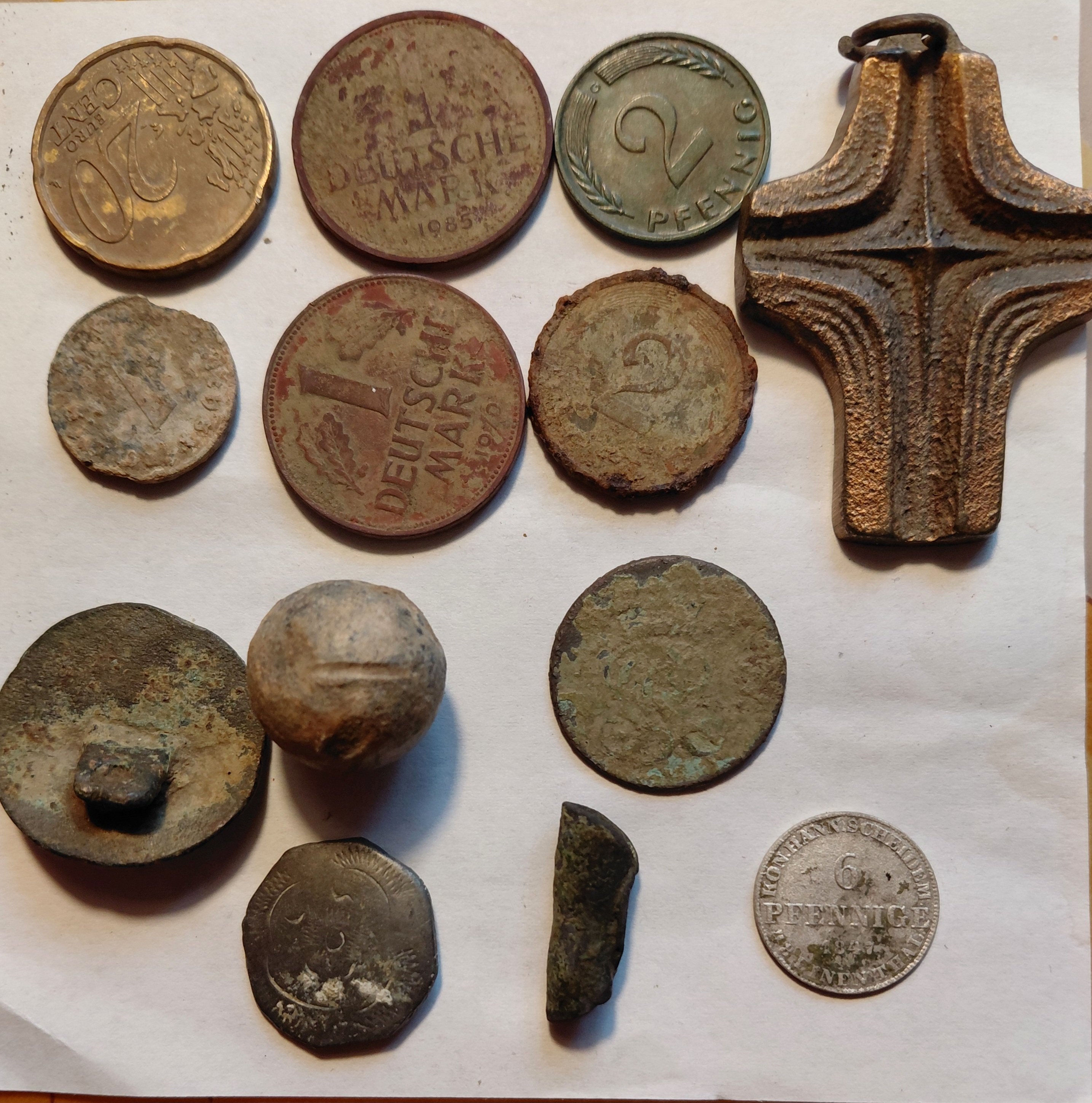 Some change, two nice old buttons, a musket ball, a (modern) bronze cross pendant and some older coins. 1 Reichspfennig (zinc) from the 1940's, a 1752 copper 1 Pfennig from Hannover, a rolled up copper coin (most likely mid-1700's) and a 1847 silver 6 Pfennig from Hannover.