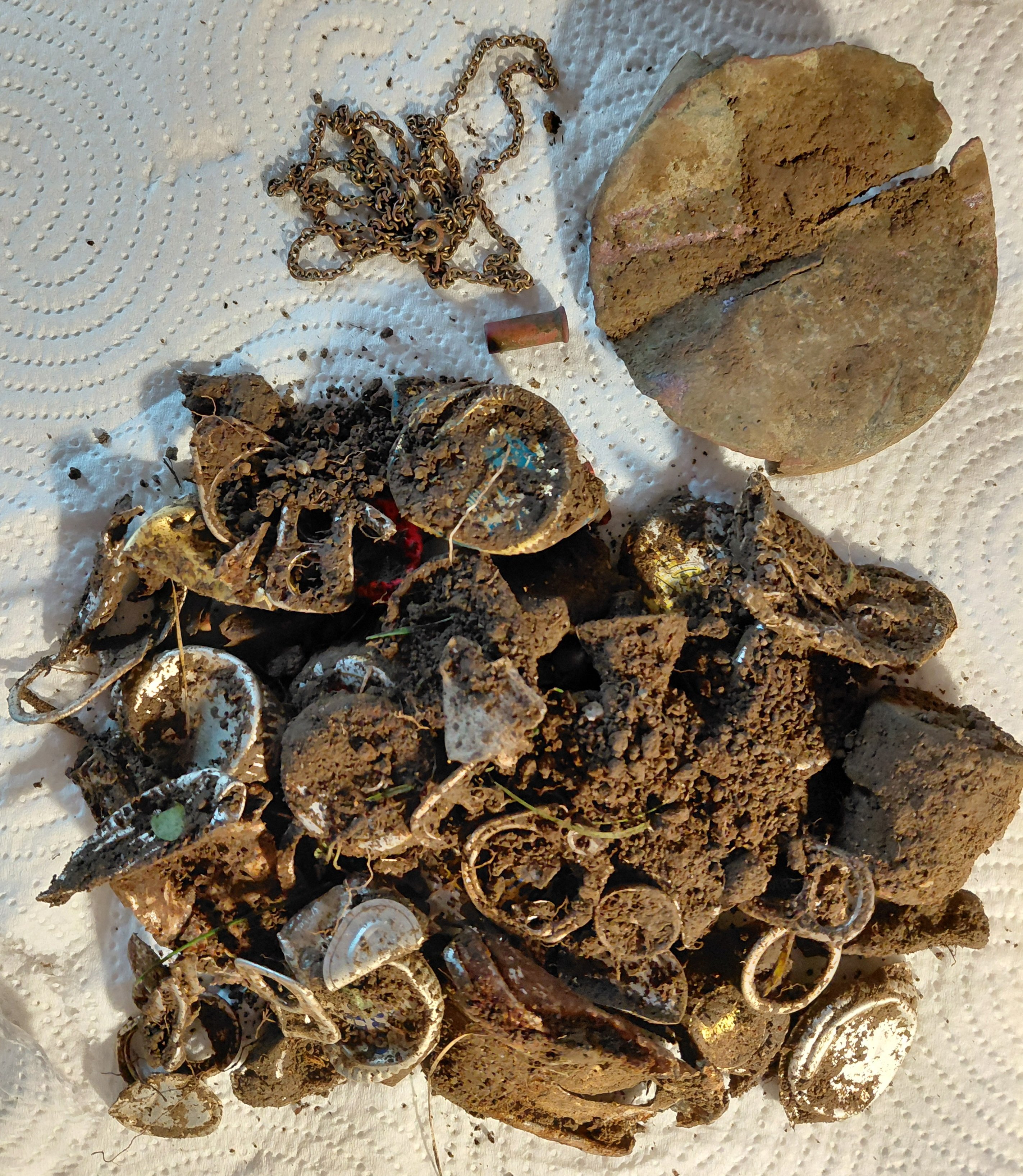 And 68 pieces of trash, including the large brass lid, a old .22 casing and a cheap rusty chain.