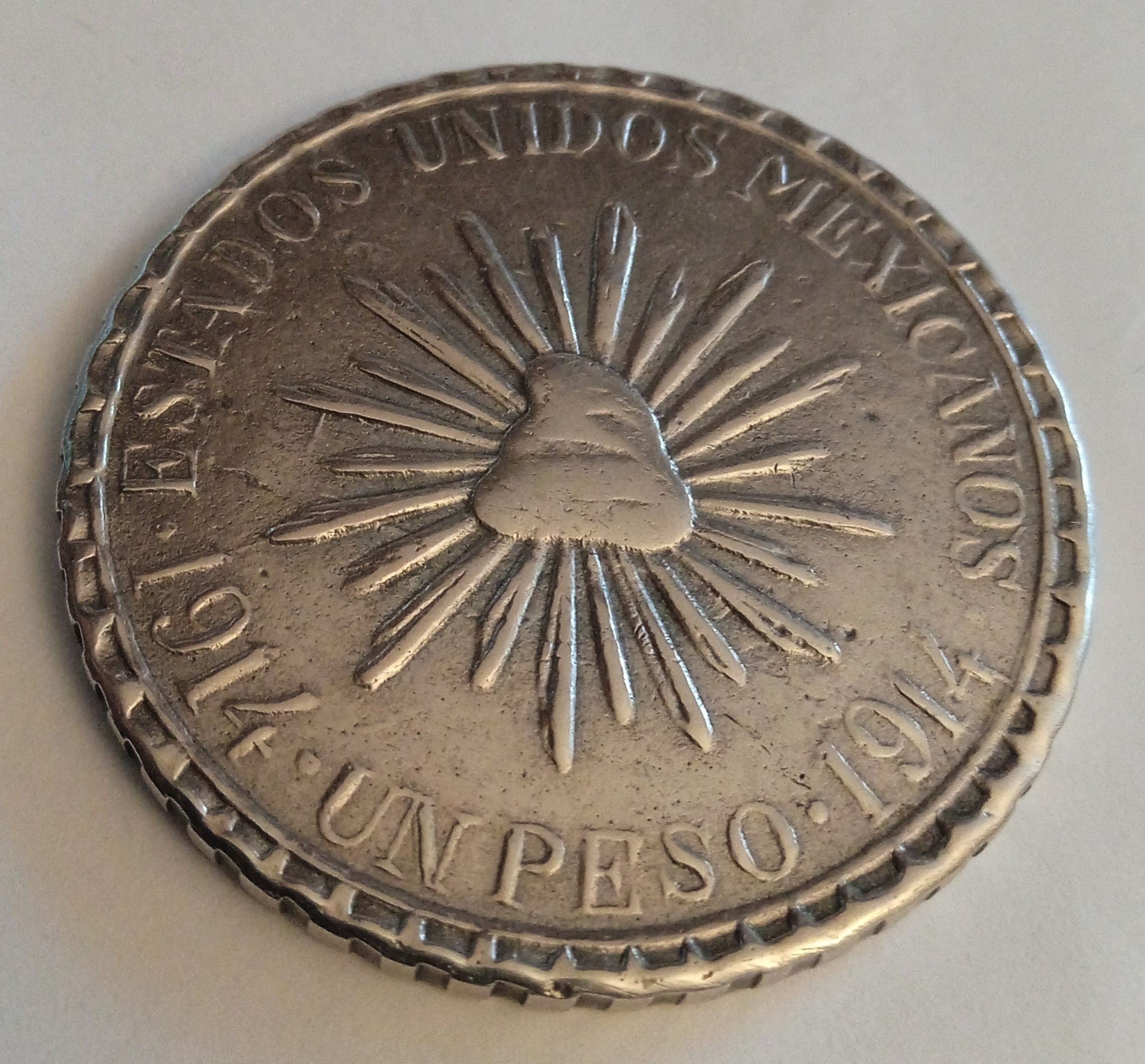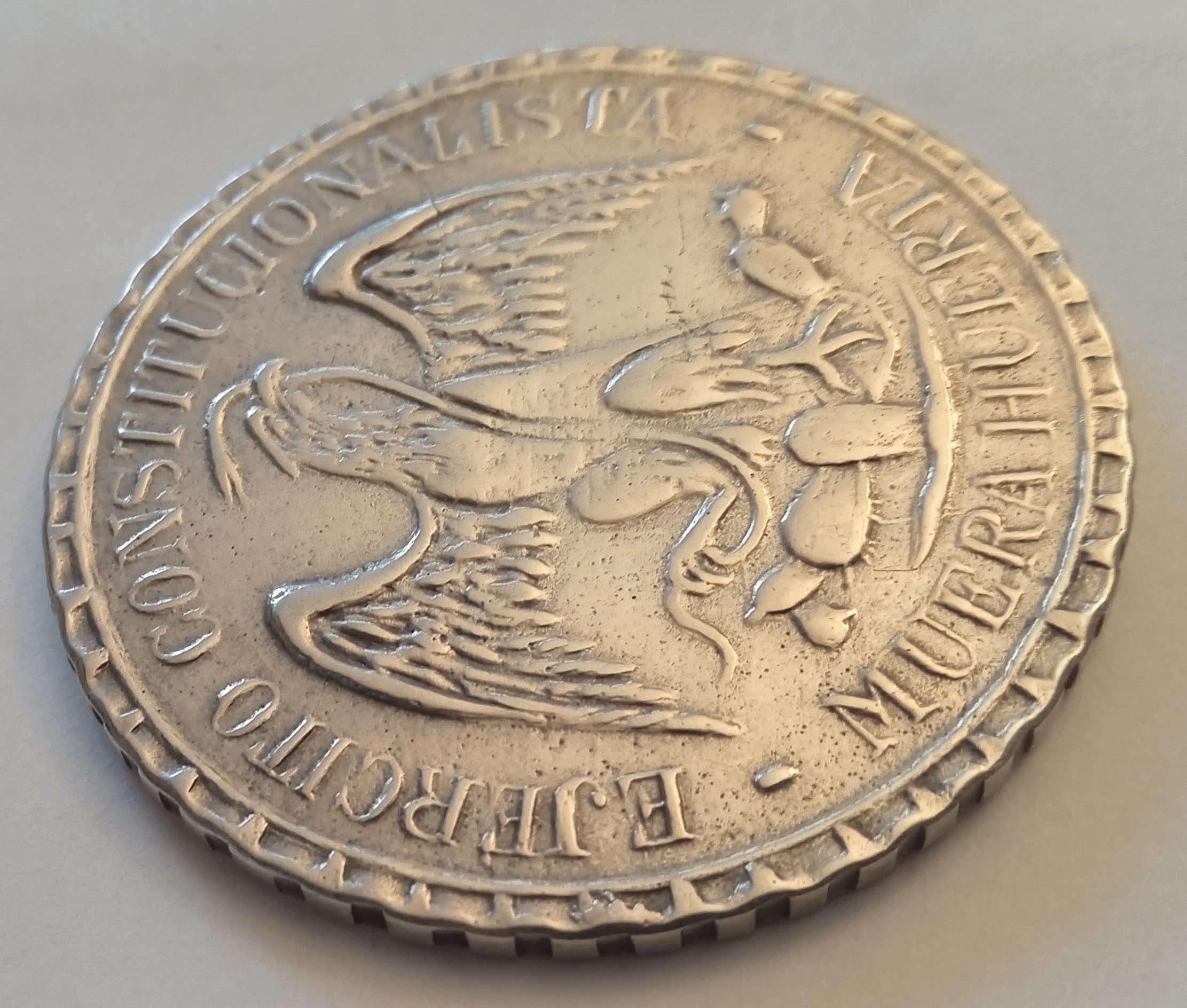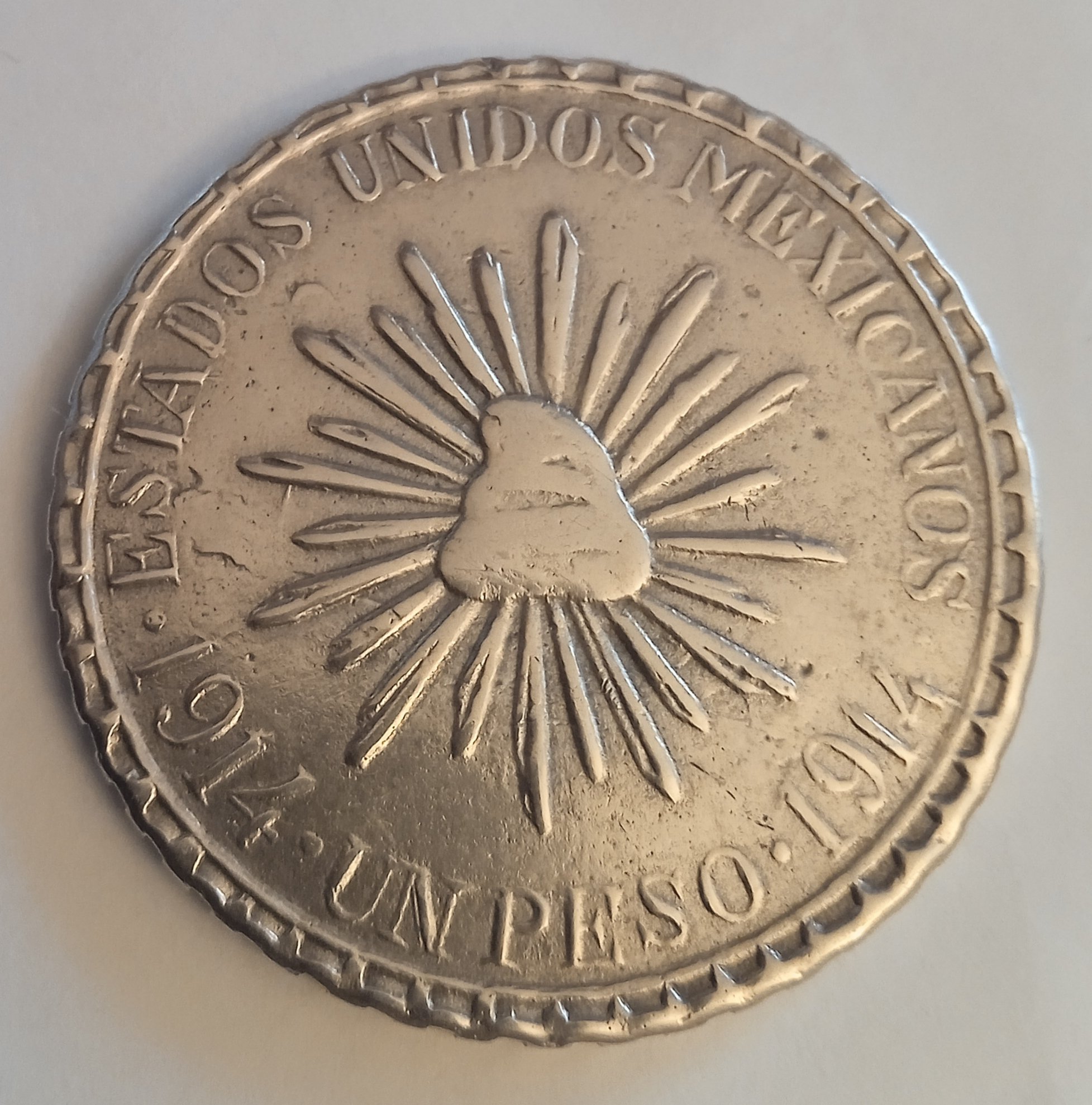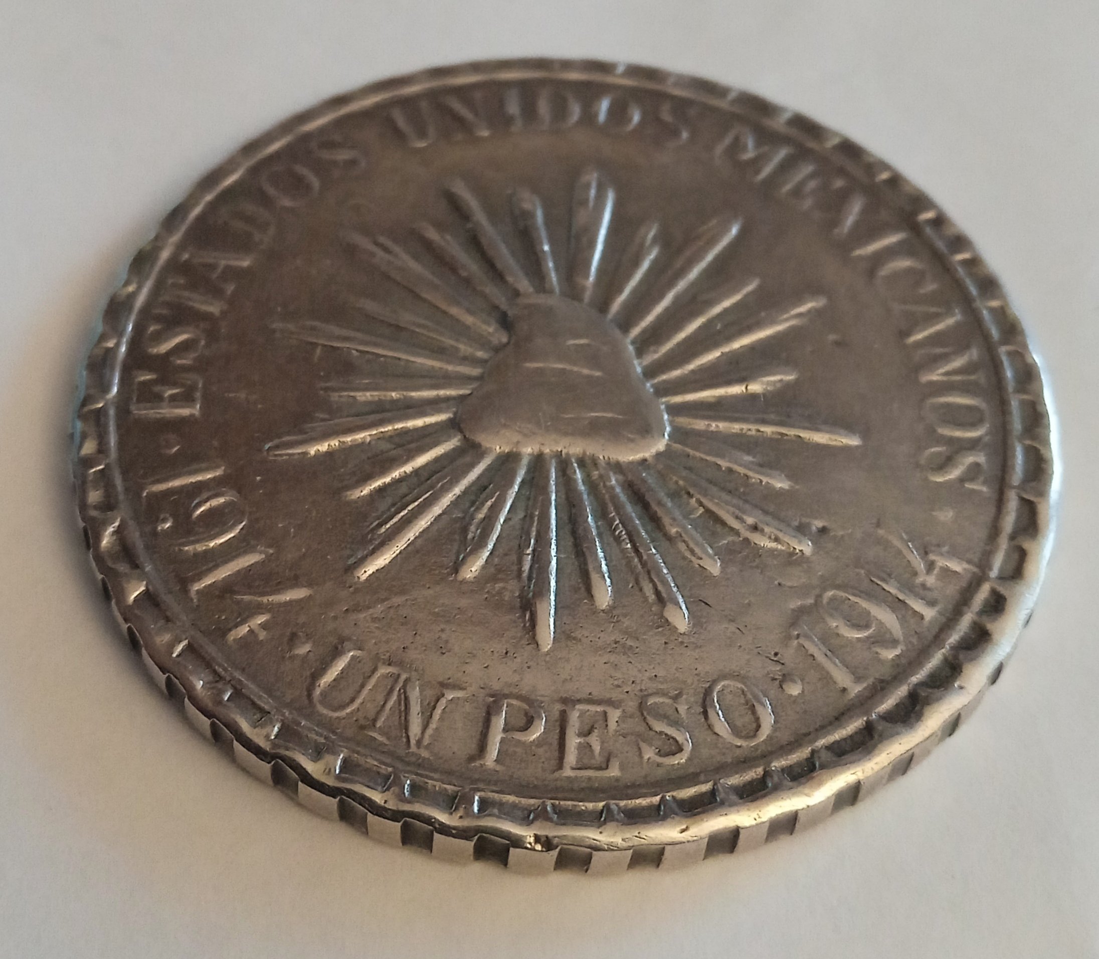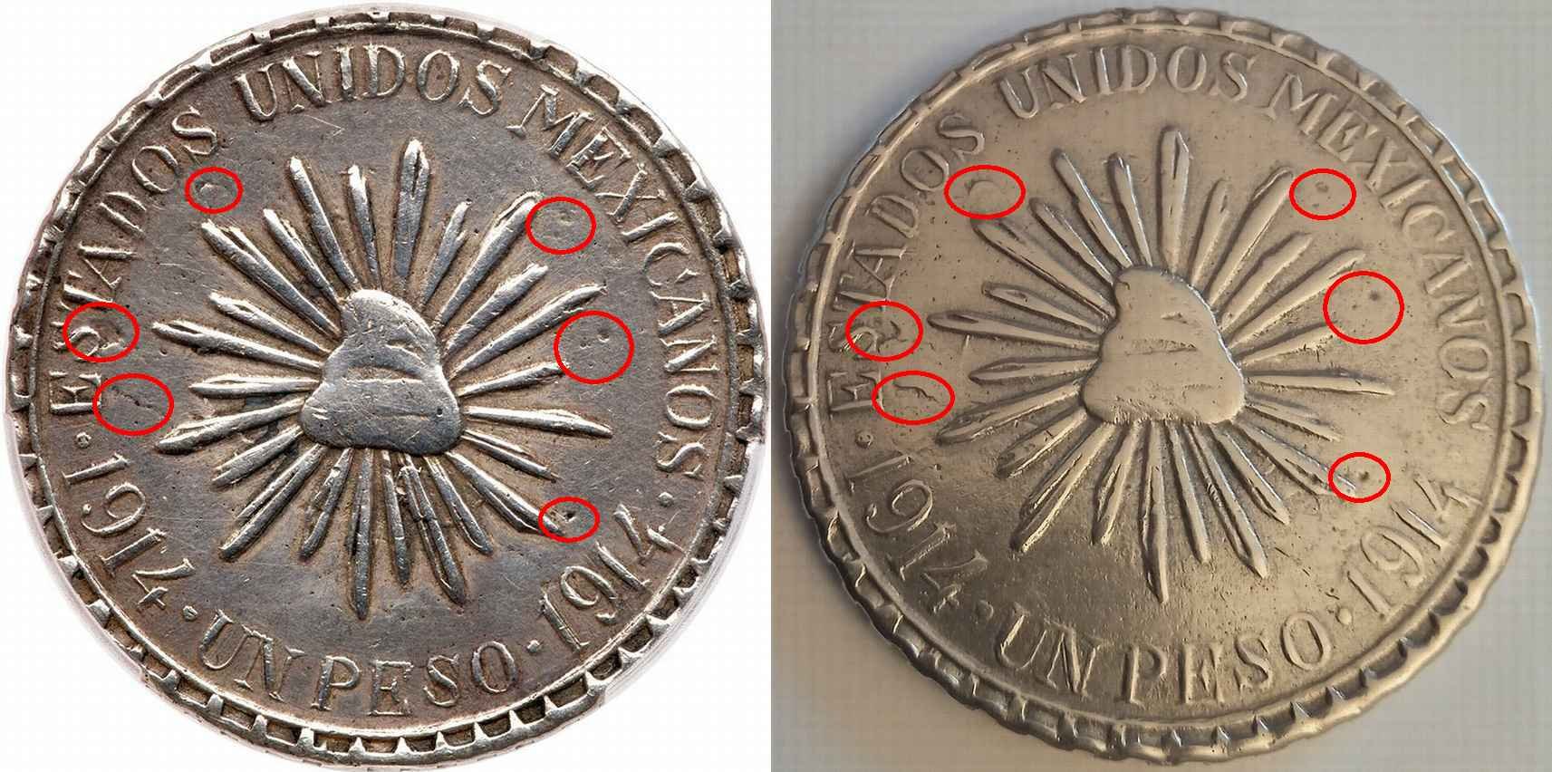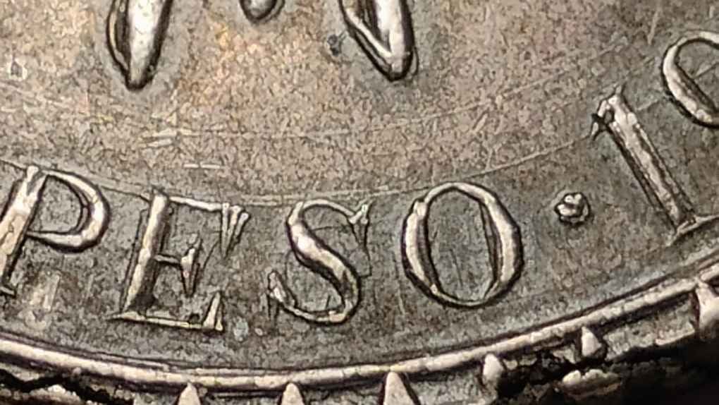 Two more strikes against the coin is that it doesn't so much ring as clunk when dropped on the desk and legitimate MH pesos typically exhibit faint raised circular alignment rings for punching the legends (see the last photo in my previous post).