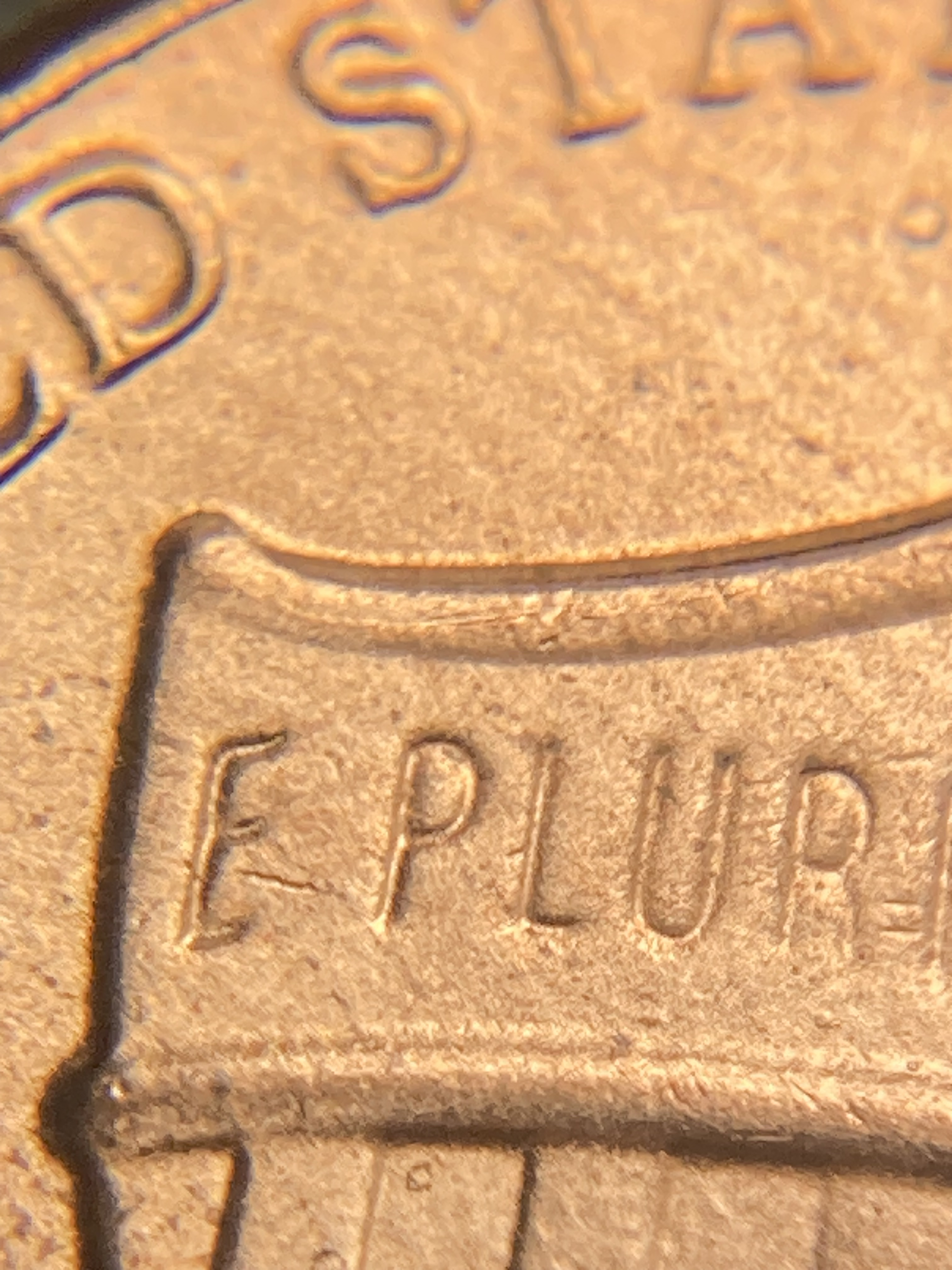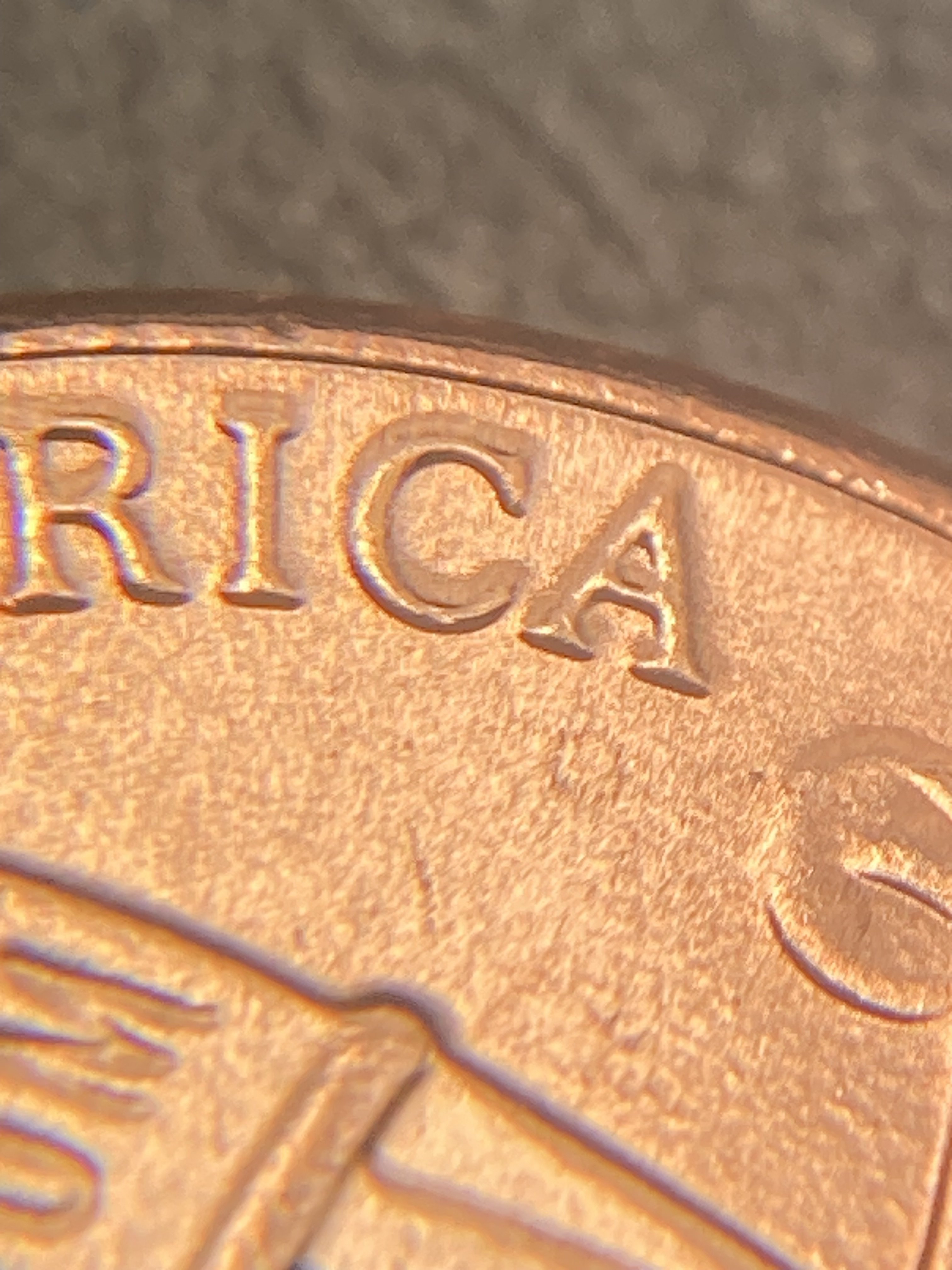 There is also splitting in America but i dont know how to pick it up on cam. I feel like the only way you can take a photo of what it truly looks like, by putting your camera pointing at the coin horizontal, almost feels like you have to line it up past the horizontal level of the coin if that makes sense lol and maybe the right hand side of the shield shows doubling.