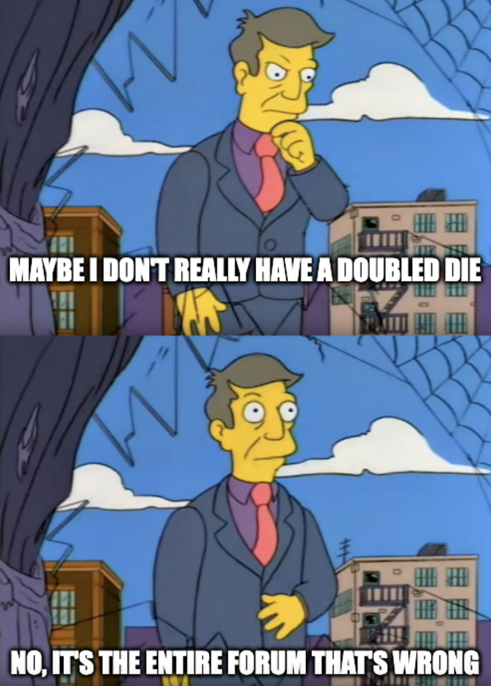 • LOL omg. Dude.. idk if you zoomed in or not but its DEFF doubled die on both sides. Ive been searching for 15 years doubled dies. You obviously didnt look hard enough or you really never seen incused doubling. I even point out the doubling….. also i am not asking questions. I am stating this os doubled die obverse and reverse lol