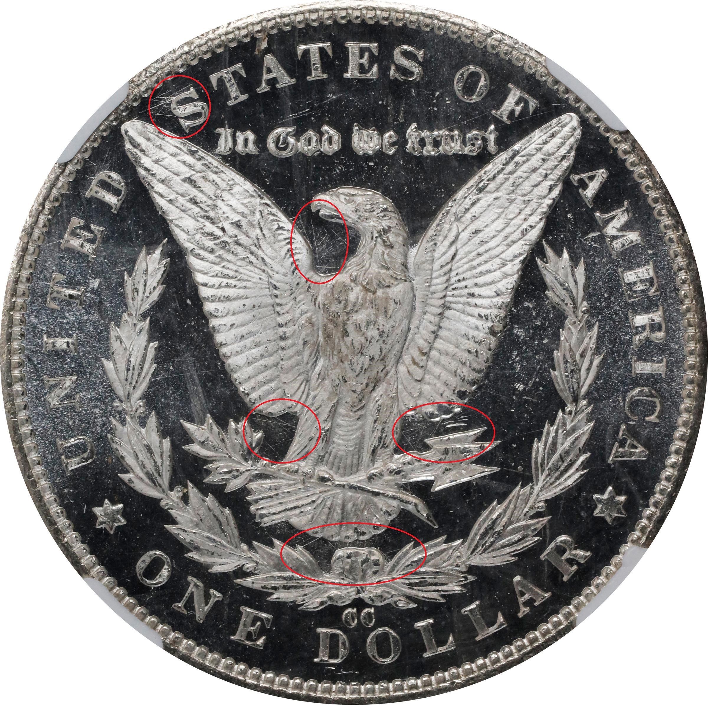 On the reverse, are these scratches or die polishing? I was unable to find other examples in Coinfacts with similar marks so I'm leaning toward scratches except they go right up to the devices and aren't like typical scratches or cleaning marks. I don't have good enough eyes to tell if they are incuse or not. I think they are raised but I can't tell for sure. PCGS rejected this one on a crossover so I'm assuming it's because of these marks.