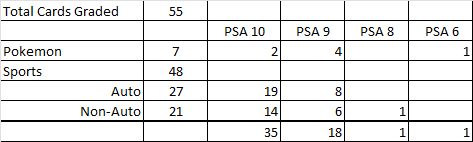 I sent a 55-card sub in July. It was a mix of Pokemon, Modern card, and Modern Auto cards. It was finished a little early. Here is the grade breakdown: