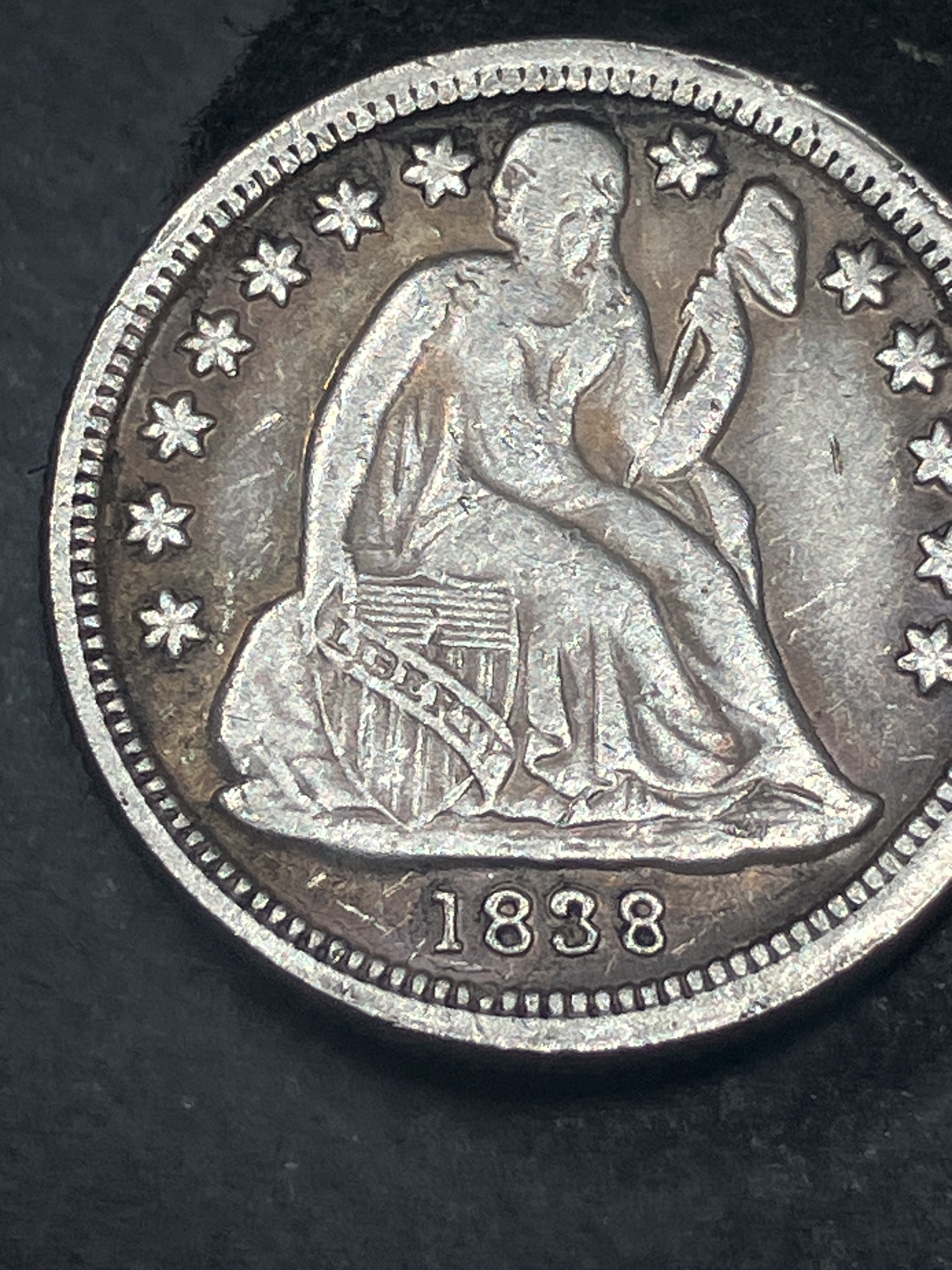 I have a 1838 Seated Liberty Dime with an upright shield and drapery at the left elbow, which both began appearing on the 1840 Dime. Why would these features be on my 1838 Dime?