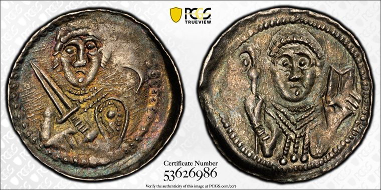 Polish Denar from the 1140s. This is a tiny coin but with a lot of detail for the time. Graded 64.