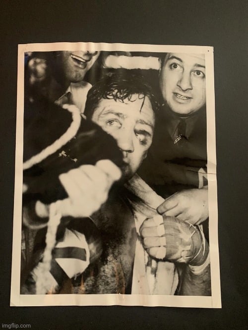 Freddie Mills and world light heavyweight champion Gus Lesnevich fought two savage wars, the first one in 1946 was a knockdown-dragout that resulted in Lesnevich TKO'ing Mills, but Lesnevich paid a heavy price, Mills busted his left eye up something awful. But Lesnevich was tough as nails, good fighter, he was light heavyweight champion for seven years, although his title reign was interrupted by his service in the military which undoubtedly prolonged his reign. This is Lesnevich after his first fight with Freddie Mills.