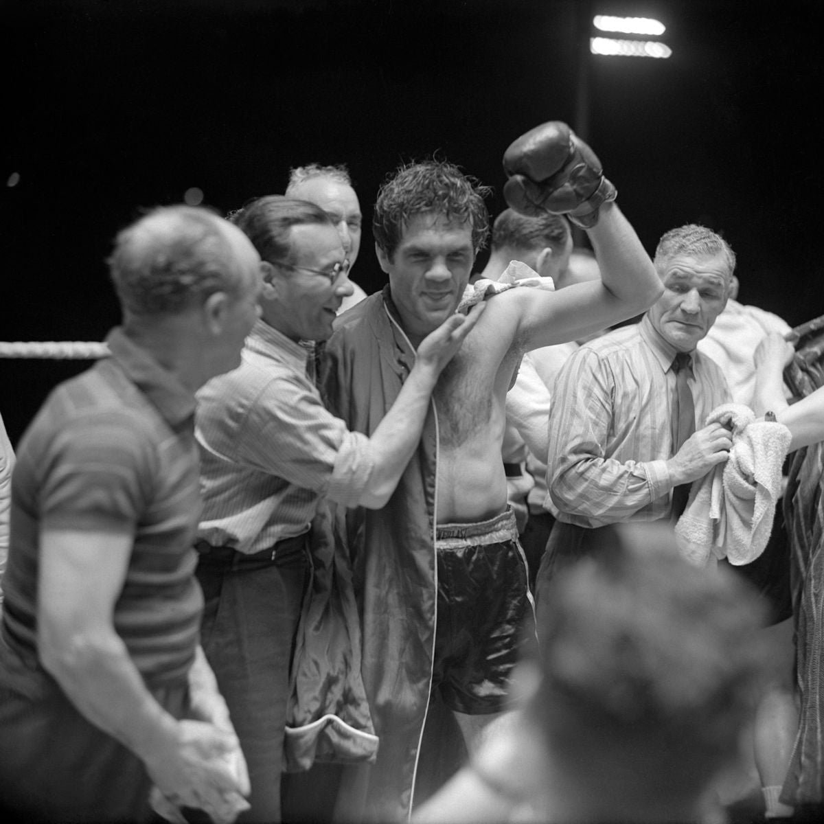 Great image from Howard Winstone vs Derry Treanor, Winstone stopped Treanor in the 14th round to defend his British featherweight title.