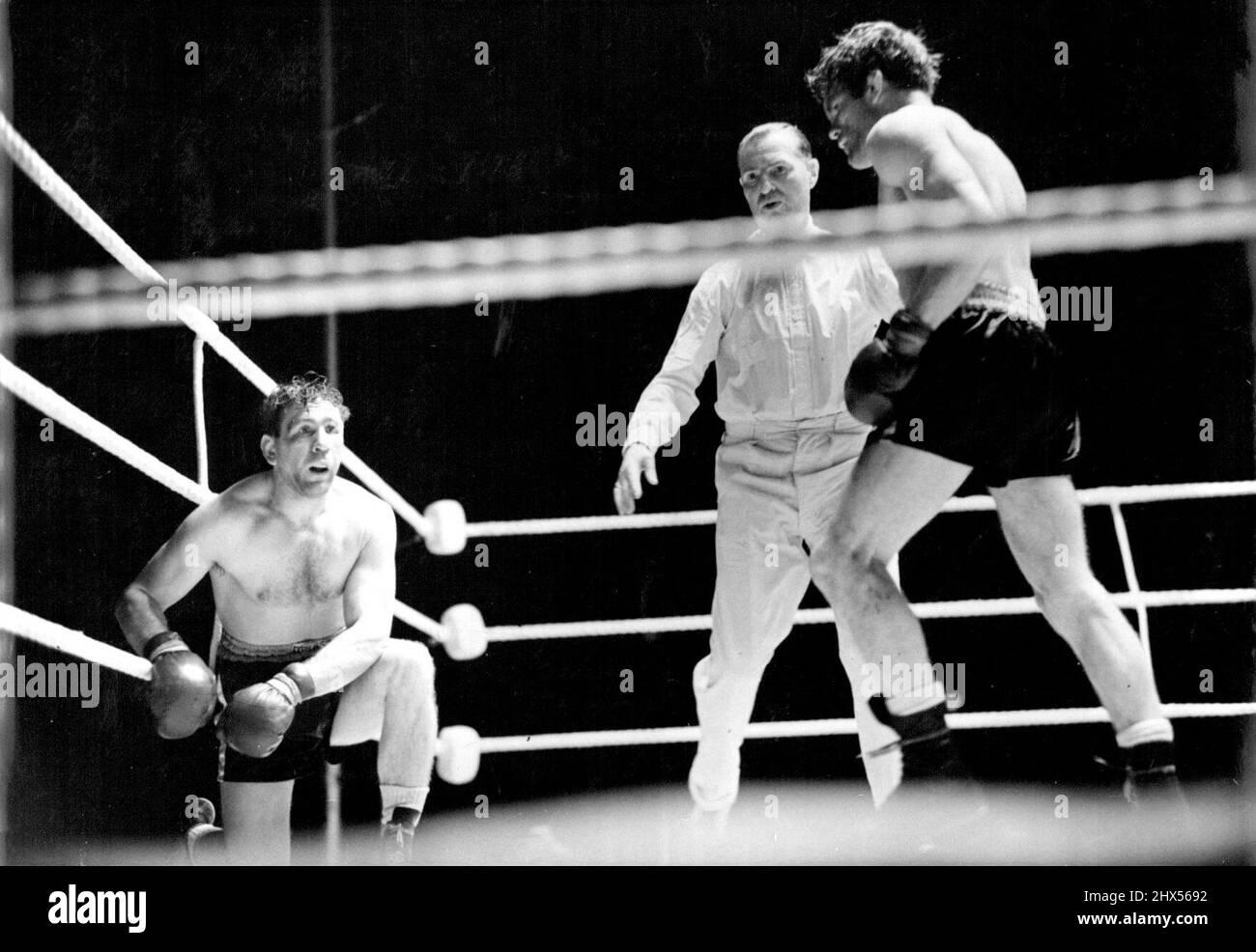 Maxie Rosenbloom lands a left hand on Larry Johnson. Well, judging by this photo, it certainly looks like Rosenbloom could hit pretty hard when he wanted to.