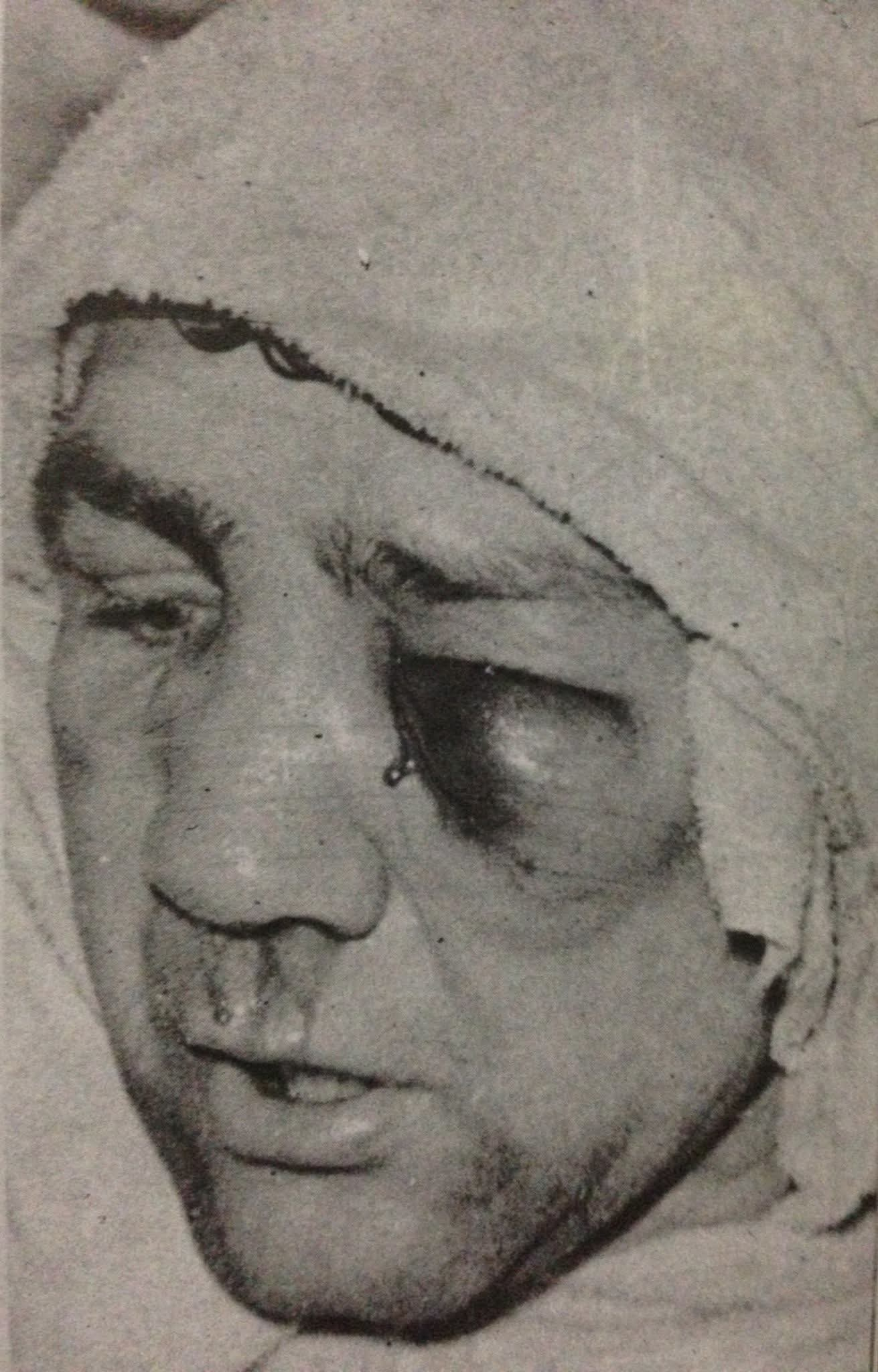 Freddie Mills and world light heavyweight champion Gus Lesnevich fought two savage wars, the first one in 1946 was a knockdown-dragout that resulted in Lesnevich TKO'ing Mills, but Lesnevich paid a heavy price, Mills busted his left eye up something awful. But Lesnevich wasa good, rugged fighter, he was light heavyweight champion for seven years, although his title reign was interrupted by his service in the military which undoubtedly prolonged his reign. This is Lesnevich after his first fight with Freddie Mills.